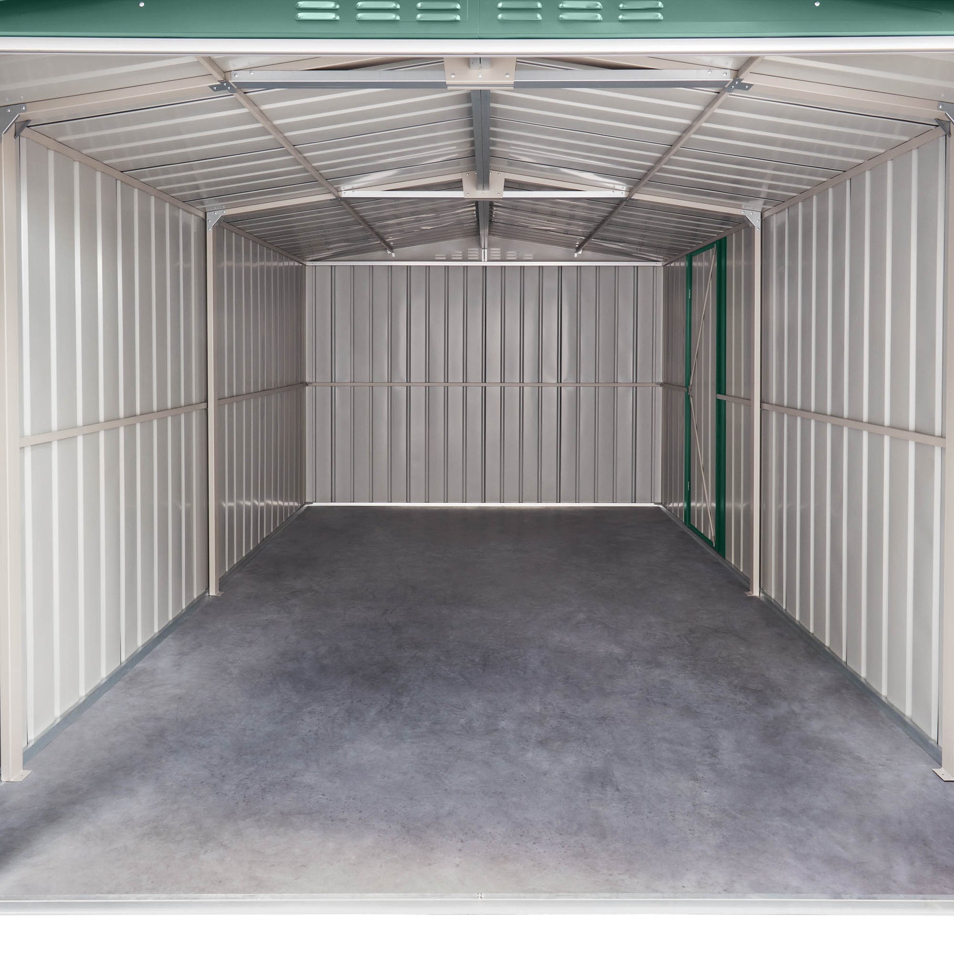 "Manufactured from high-tensile galvanised steel the spacious Globel 10 x 15 Green Dual Door Workshop Garage has been expertly designed to transform your garden storage. Crafted from high quality, weather resistant panels this shed requires no maintenance and features straightforward and stress-free assembly - perfect for busy lifestyles!