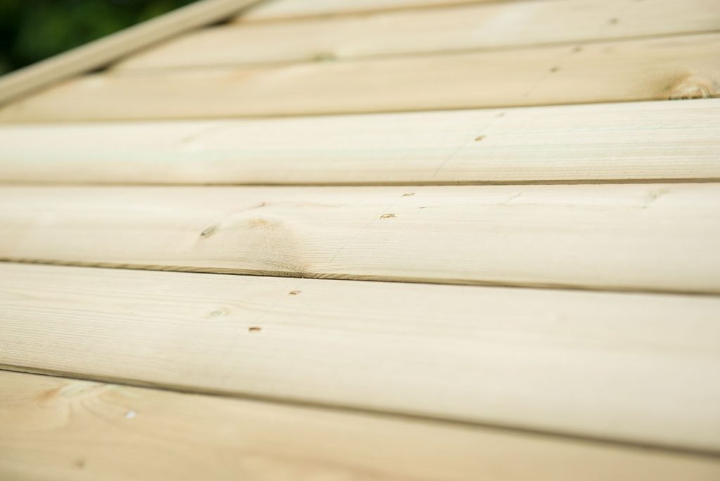 Pressure treated softwood is formed into a Log Lap roof structure and placed on top of a water-proof Tricoya lining, giving the Gazebo a simple, elegant and cost-effective finish.