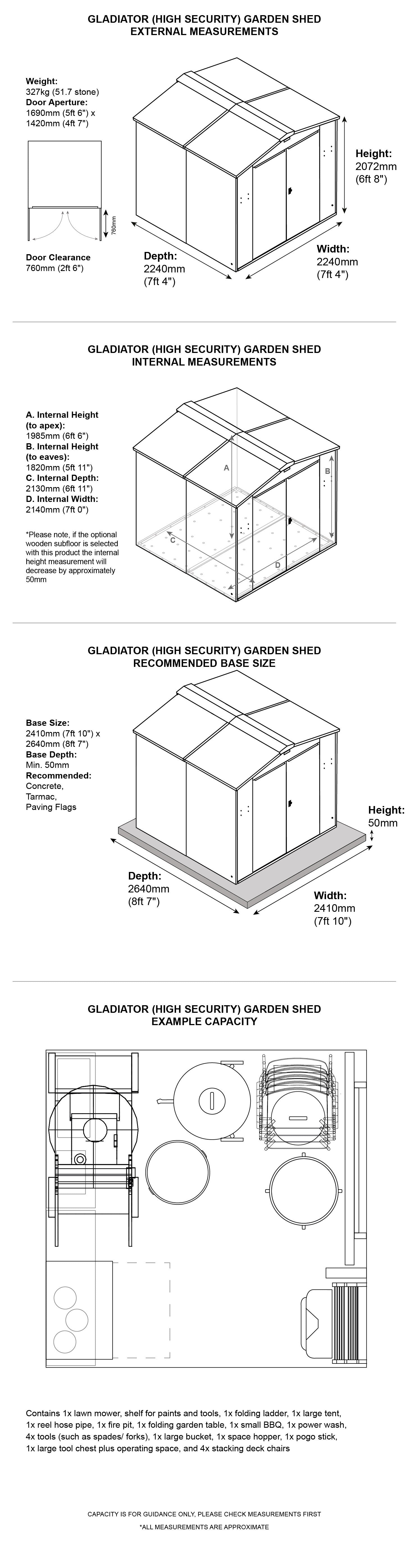 - At 326kg in weight (that's 51.7 stone) - the Gladiator is the heaviest of our Metal Sheds.