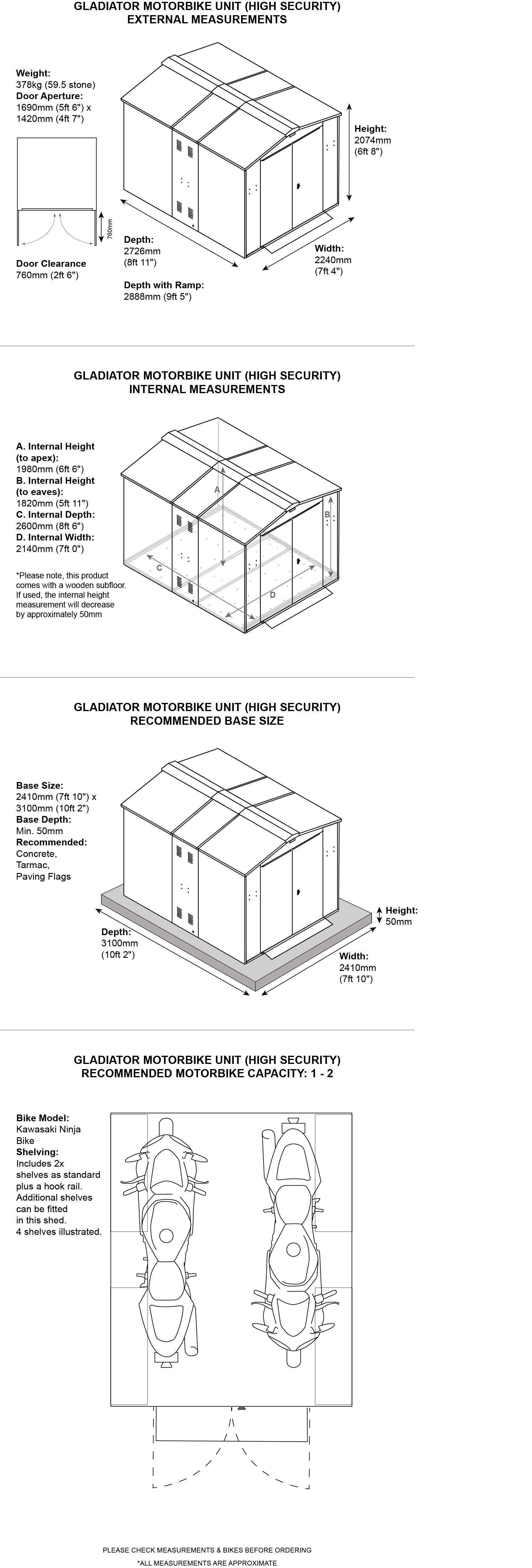 This 8ft 11” x 7ft 4” Motorbike Storage Garage is a large, heavyweight steel structure which will sit firmly on the ground, wherever you choose to put it. Despite the spacious size this motorcycle shed does not require planning permission** to erect, but will serve a solid garage-like structure to store your bike in.