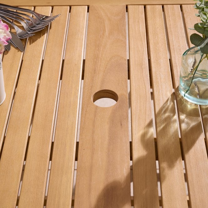 The Ashdown Folding 6 Seat Oval Dining Set With Cushions comprises of an oval table with useful 50mm parasol hole, and six chairs with comfortable seat pads.