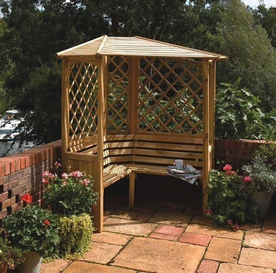 The Balmoral Arbour from Rowlinson is designed to fit in any right angled corner, providing the perfect place to sit and relax in to enjoy your garden. Featuring open slatted roof and diamond lattice sides and back. Manufactured from FSC pressure treated timber with a natural finish, this arbour could be personalised by painting or staining to suit your garden theme. Rowlinson supply their arbours flat packed with all the necessary components for an easy home assembly.