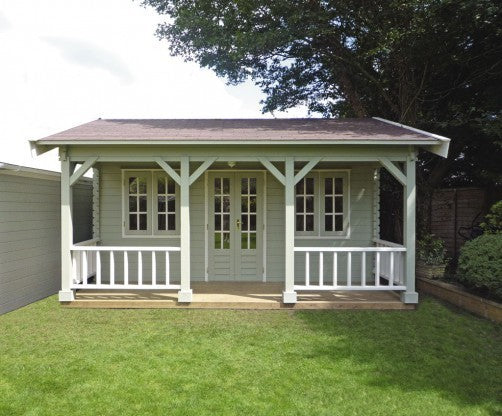 This is our modern Dubai log cabin from the Lugarde range (550cm x 500cm). The Dubai log cabin has a very attractive design with elegant features such as the; double door, 2 casement windows and posts. This log cabin would make a fantastic feature in your back garden and would be ideal for use as a garden office or maybe a study area for children.
