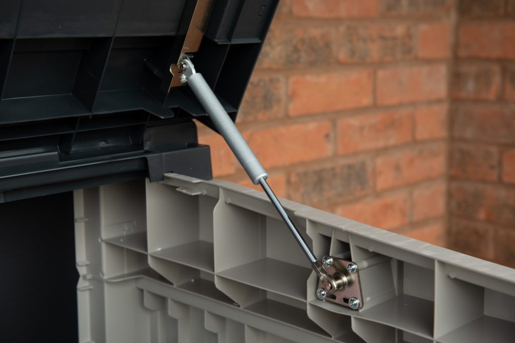 The lid benefits from having two gas pistons that provide assisted lifting of the lid and keep it open when required. The turn handle at the front secures both doors and lid closed and can be locked with the use of a padlock to keep the contents of the store secure.