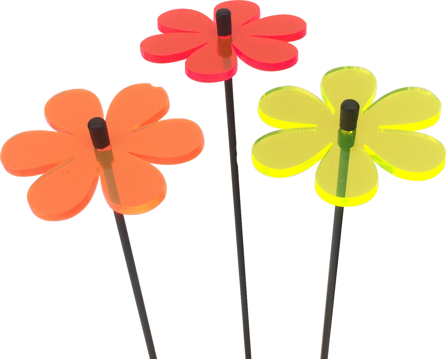This Set of 3 SunCatchers 'Daisy' consists of:- a three wide, glowing light collector in red, orange, yellow, green or blue- three 25cm long, black swing rod,- matching support rings and end caps, planted it is about 20cm high and looks great in your flower bed or pot.