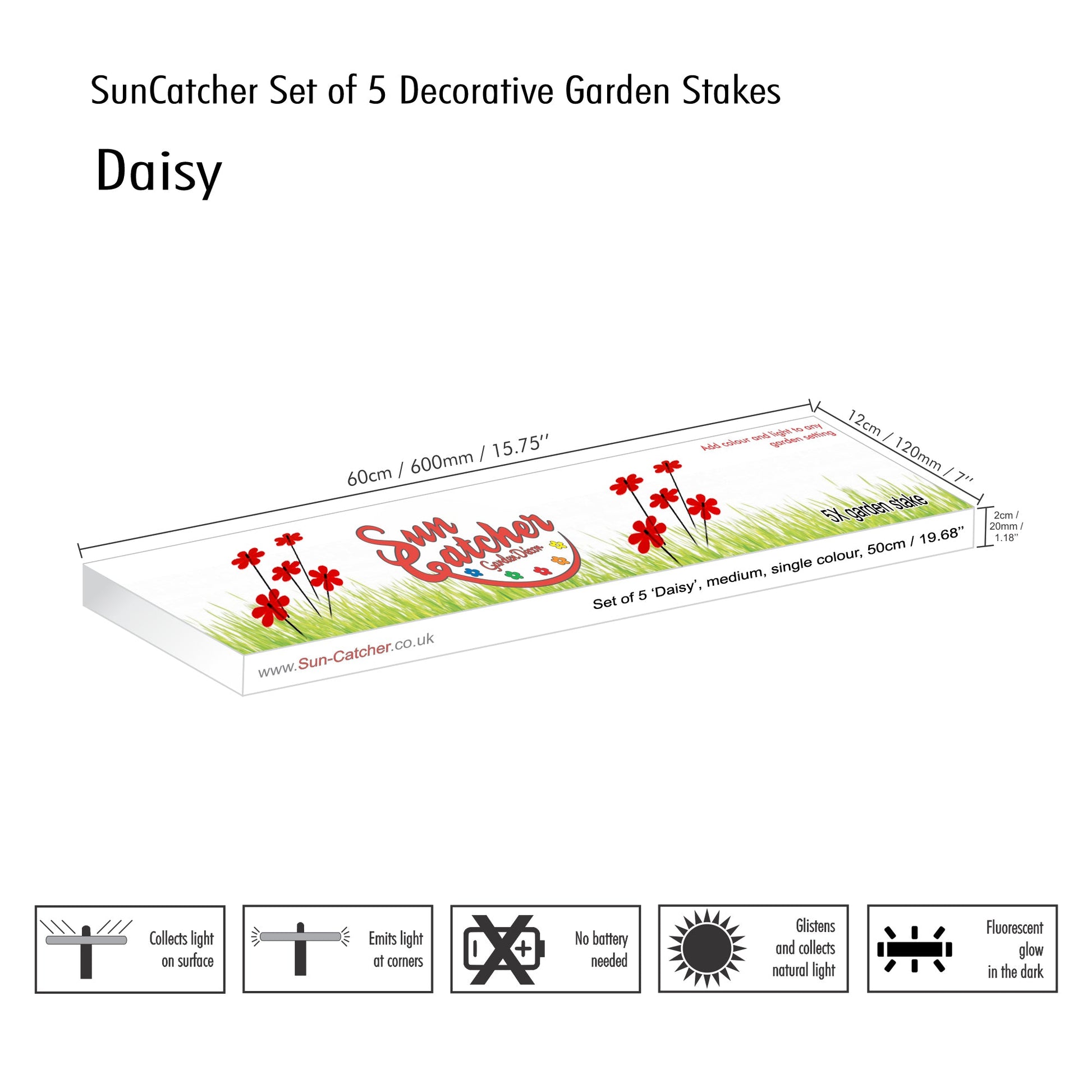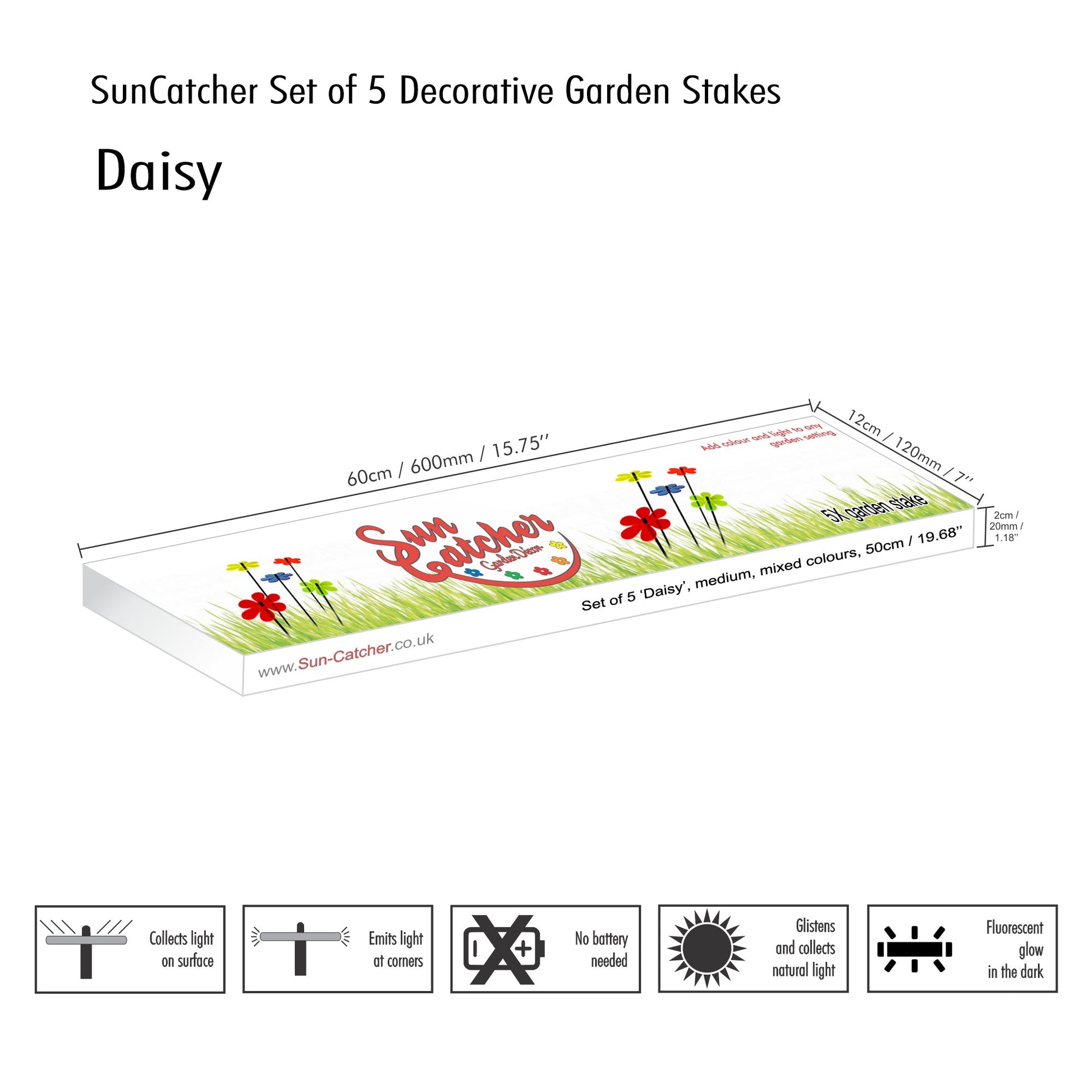 This Set of 5 SunCatchers 'Daisy' consists of: - five 100mm wide, glowing light collector in red, orange, yellow, green or blue - five 50cm long, black swing rod, - matching support rings and end caps