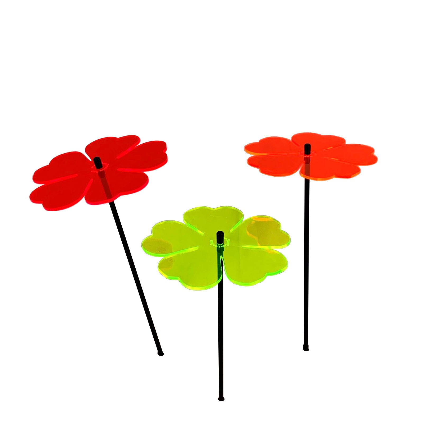 This set of 3 SunCatchers 'Double Leaf Flower' consists of: - three wide, glowing light collector in red, orange, yellow, green or blue - three 75cm long, black swing rod,- matching support rings and end caps. Planted each SunCatcher is about 70cm high and looks great in your flower bed or pot.