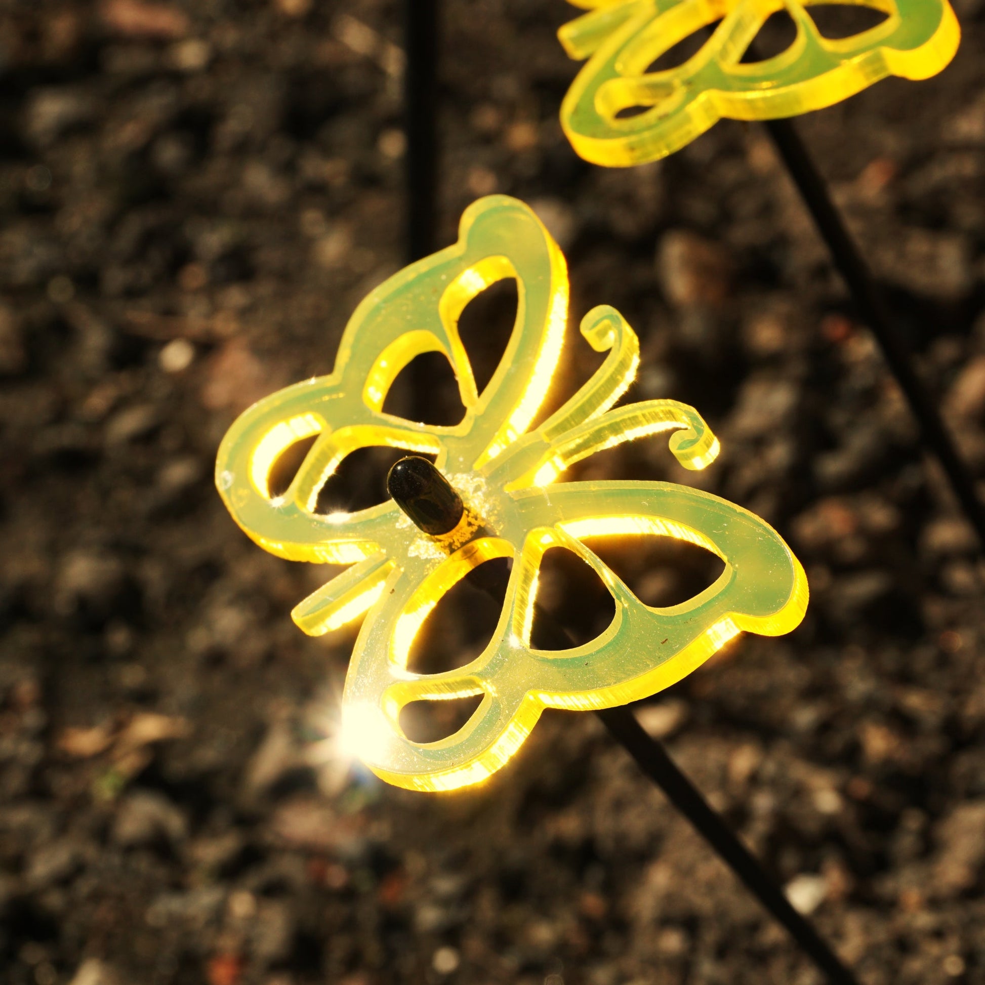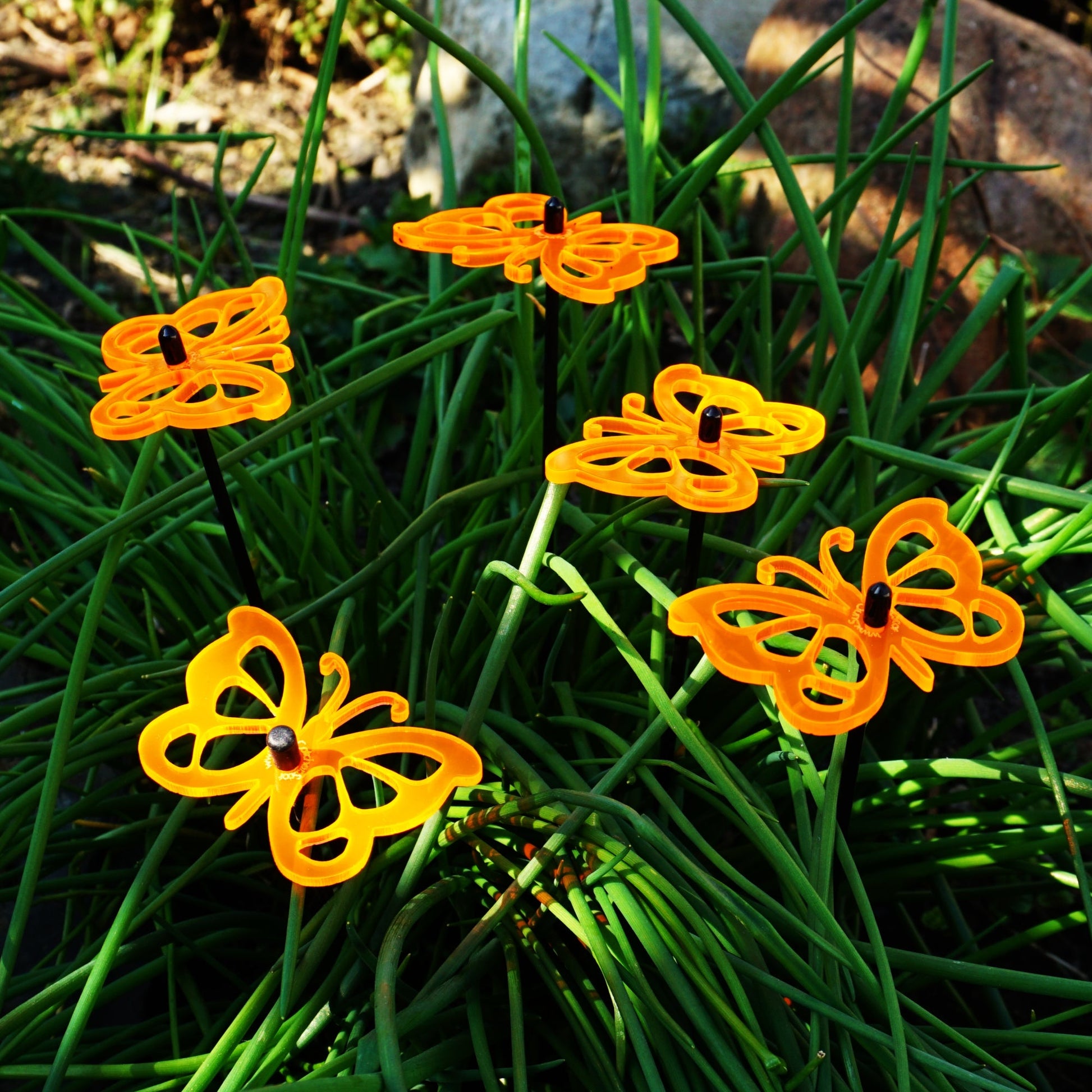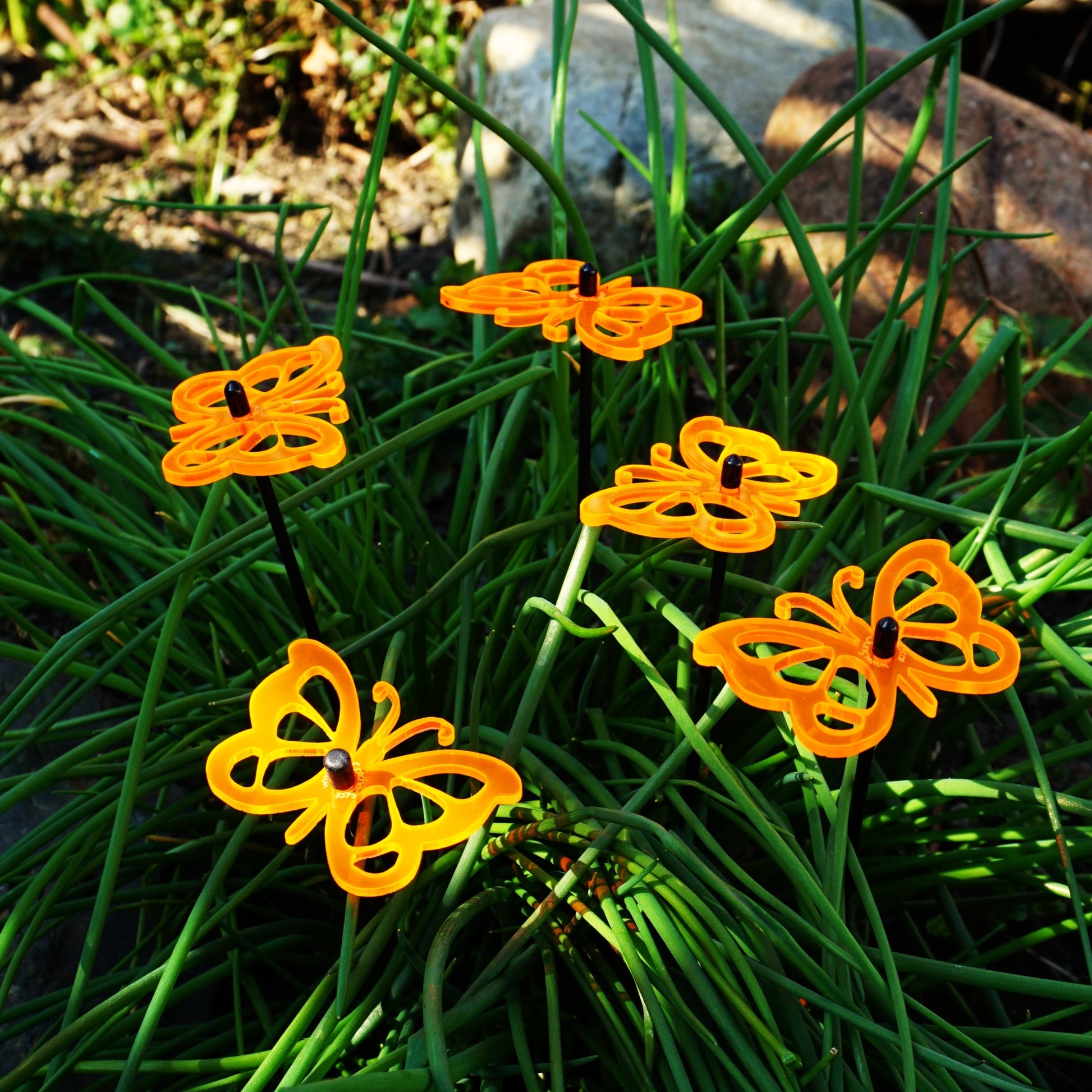 About these SunCatchers ... This Set of 5 small SunCatchers 'Butterfly' consists of:- five wide, glowing light collector in red, orange, yellow, green or blue- five 25cm long, black swing rod,- matching support rings and end caps. Planted it is about 20cm high and looks great in your flower bed or pot.