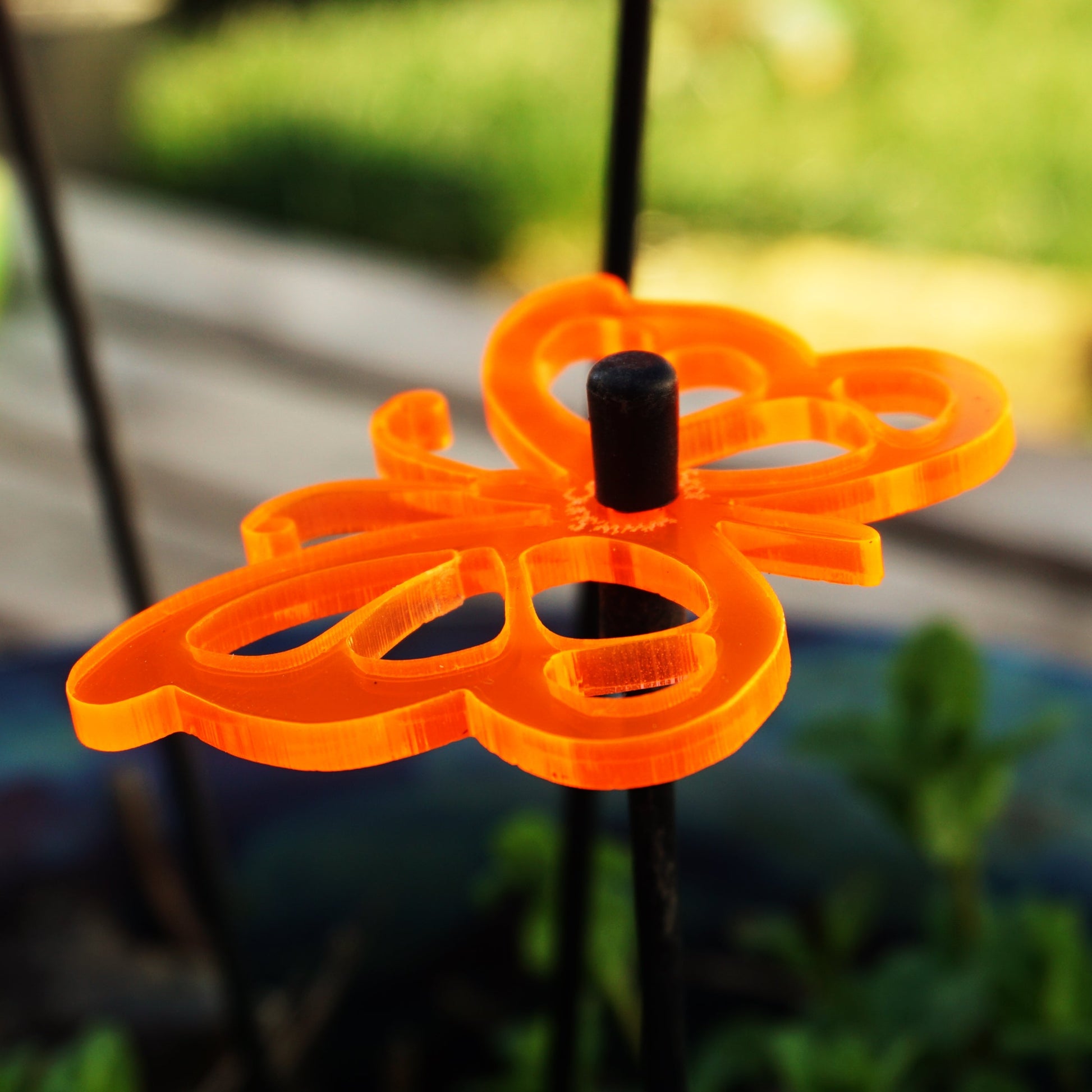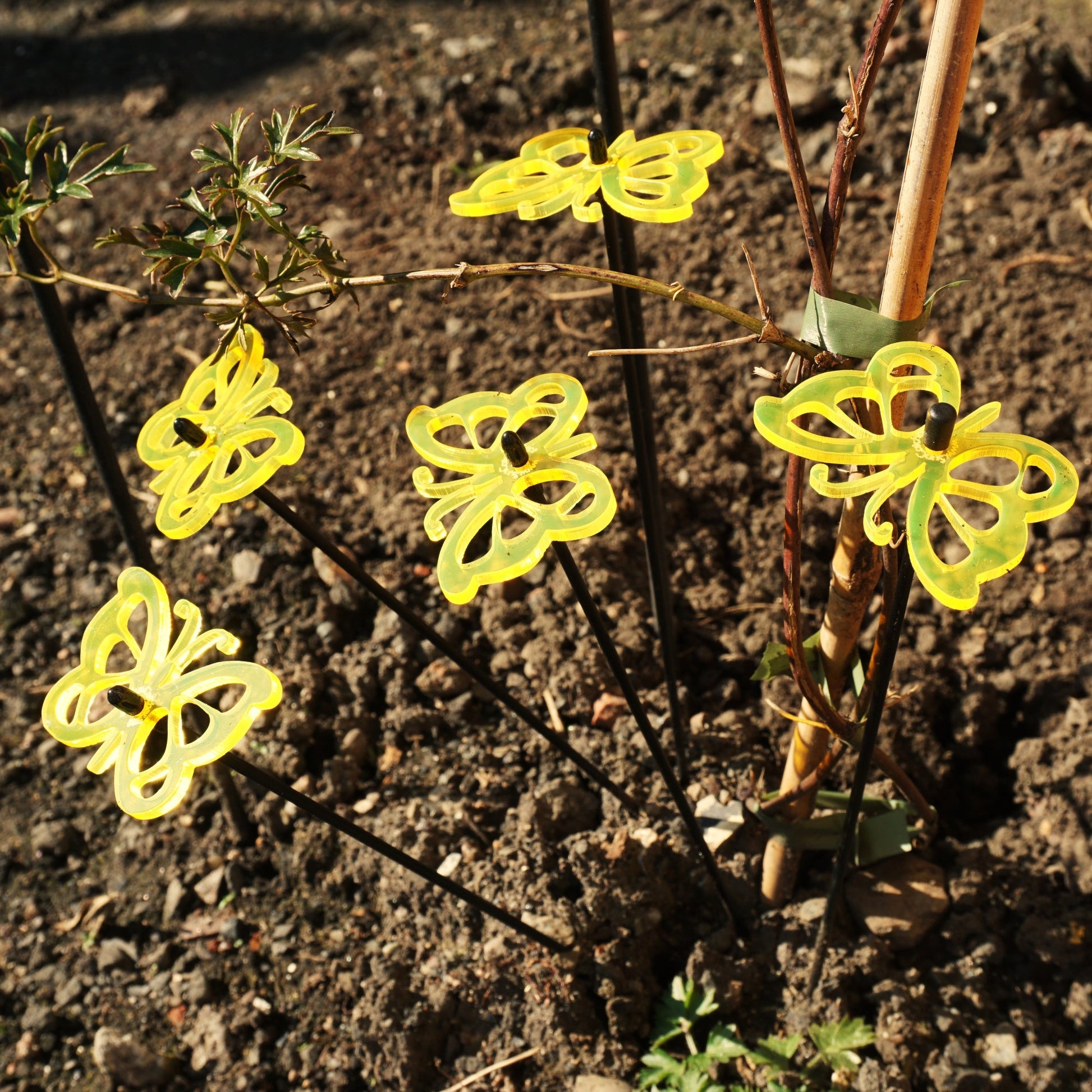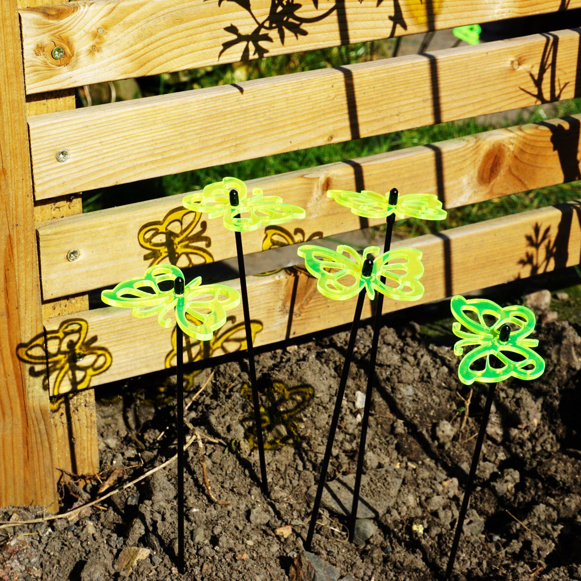 About these SunCatchers ... This Set of 5 small SunCatchers 'Butterfly' consists of:- five wide, glowing light collector in red, orange, yellow, green or blue- five 25cm long, black swing rod,- matching support rings and end caps. Planted it is about 20cm high and looks great in your flower bed or pot.