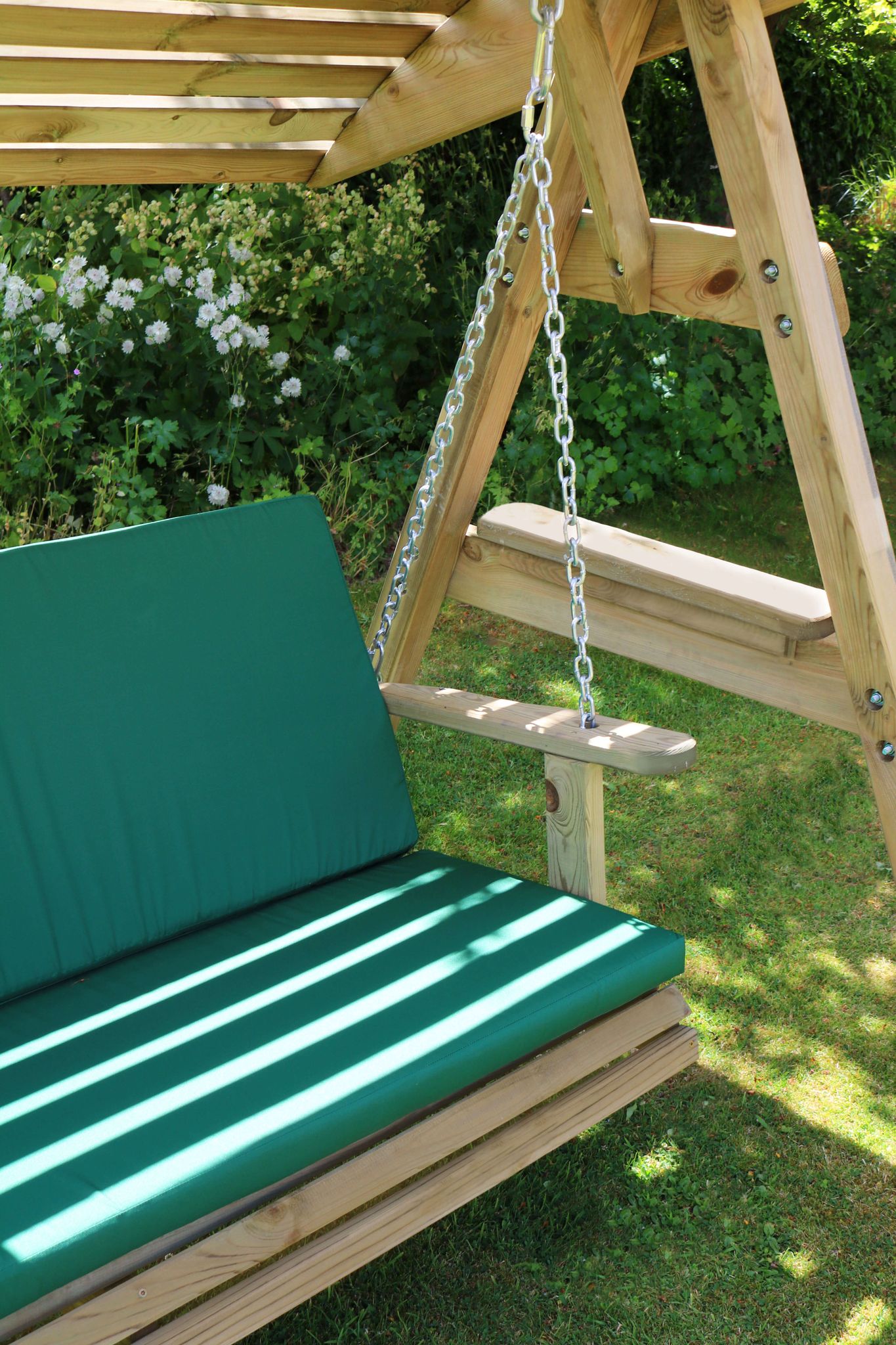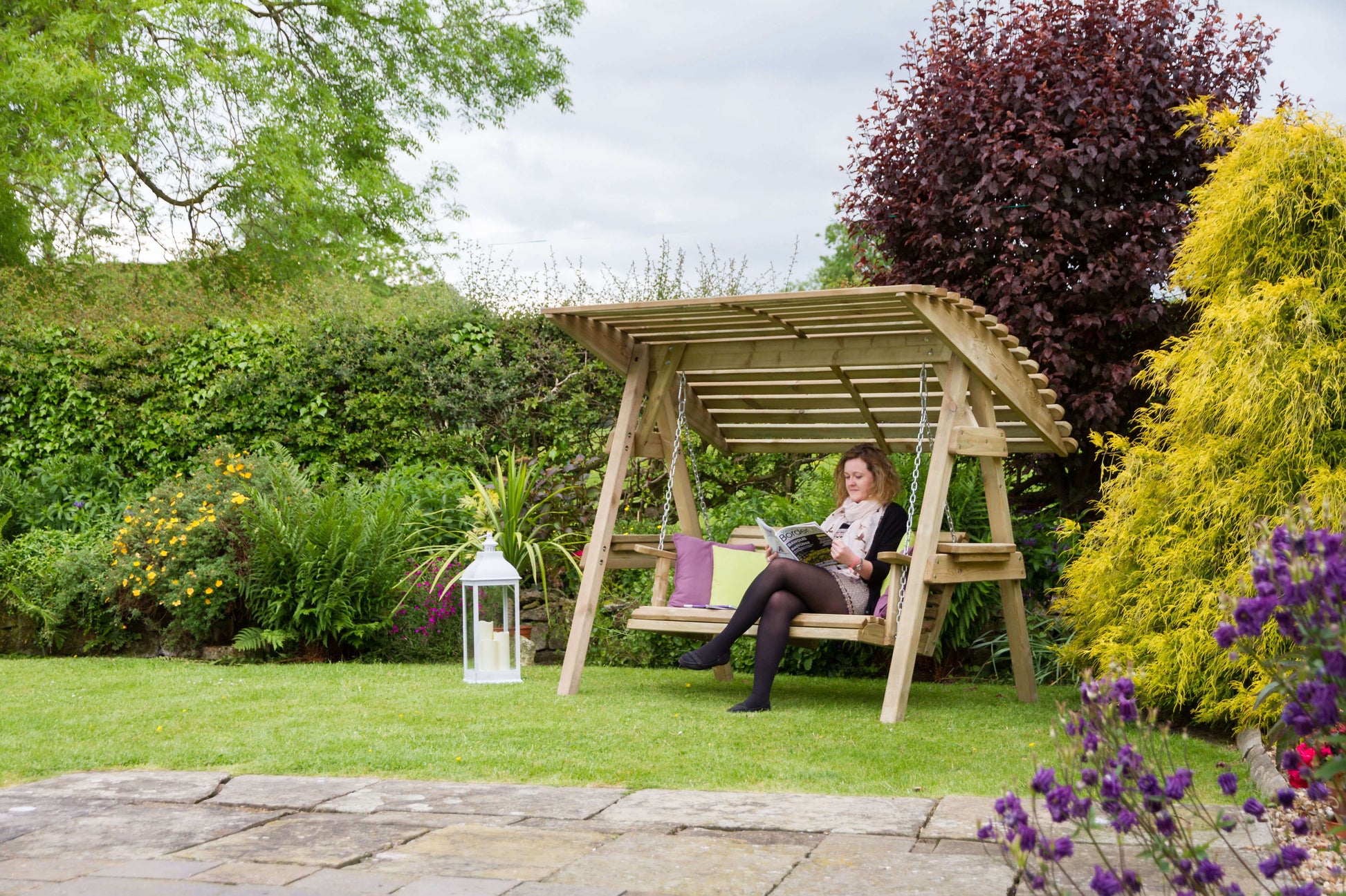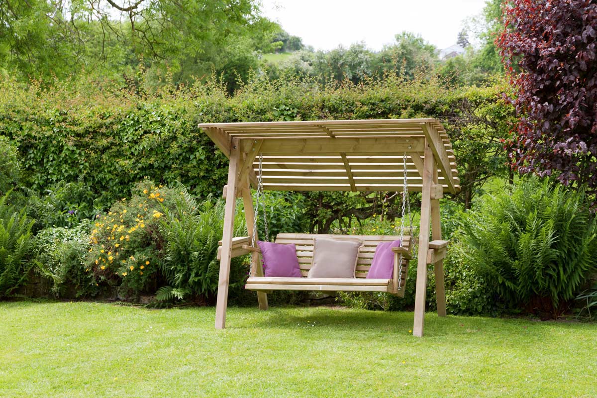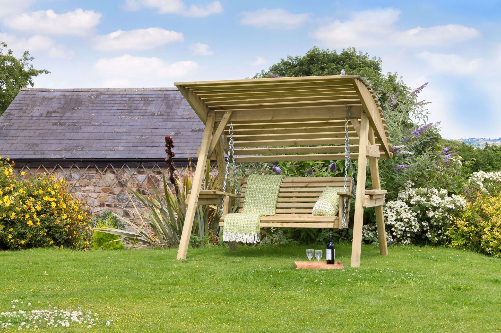 The Miami Swing Seat has a fixed wooden canopy and a comfortable 1.2m swing seat. The elegant, yet strong design comes with two removable shelves that easily slot onto the armrests for summertime drinks.