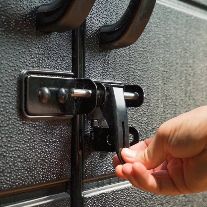 - Upper And Lower Metal Latches Keep Doors Closed And In Place