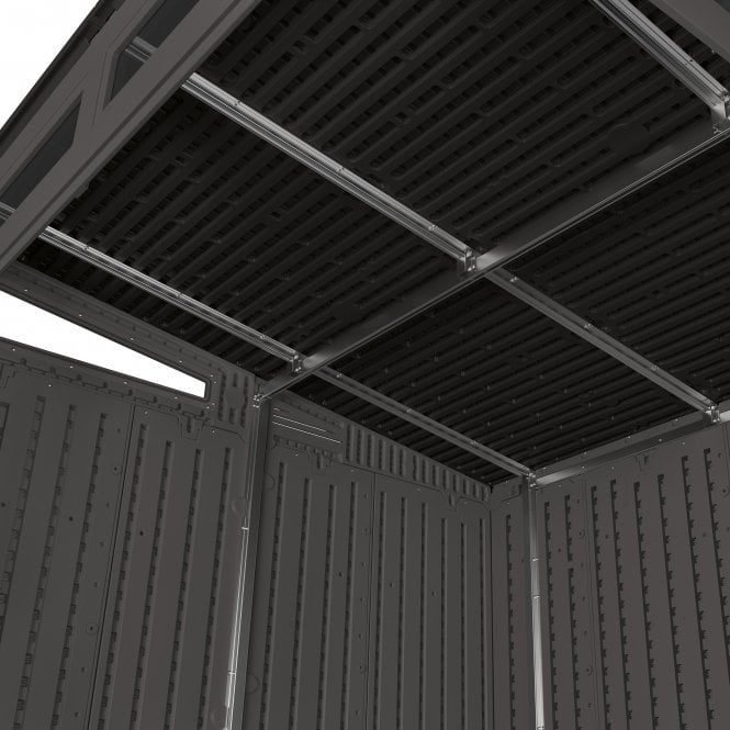 With 9m3 of storage space, the 7 ft. x 7 ft. Modernist® Storage Shed by Suncast® is ideal for storing all your outdoor equipment, whether small or large. The reinforced resin floor is built to withstand heavy loads, including mowers and other outdoor equipment. Sturdy double doors allow you to access your items easily and is equipped with pad-lockable metal handles (resin handle, metal slide latch) for added security (lock not included). Constructed of metal reinforced, multi-wall resin panels, this sturdy shed is weather-resistant and easy to maintain from season to season.