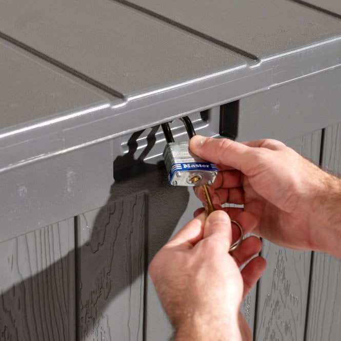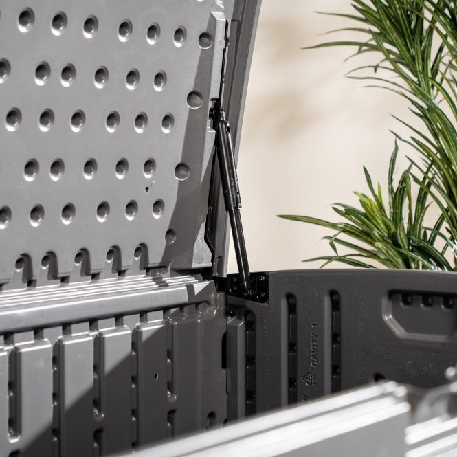 The Suncast Montana 757L Storage Box offers stylish, durable and practical garden storage. The lockable soft close lift up lid allows easy access to the large 757 litres of storage space which is capable of holding a wide variety of items including cushions, garden supplies and outdoor accessories. This low maintenance all weather storage box is constructed from multi-wall resin ensuring strength and stability as well as water resistance and UV protection. Supplied in an attractive peppercorn grey, the sleek Montana 757L Storage Box will enhance your garden storage.
