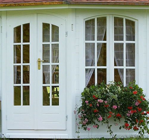 An octagonal summerhouse, the Nantes 300 measures 3m (9'8) in diameter, of course this can be made in any size your require. This building has 4 arched windows and a double door to the front in matching style. In the picture the building has been factory painted.