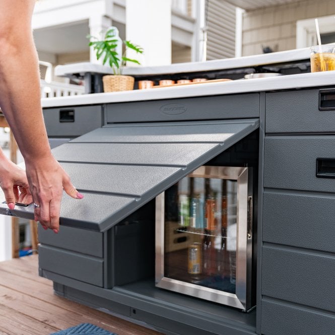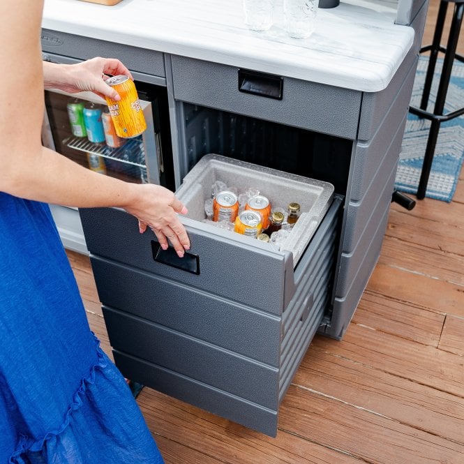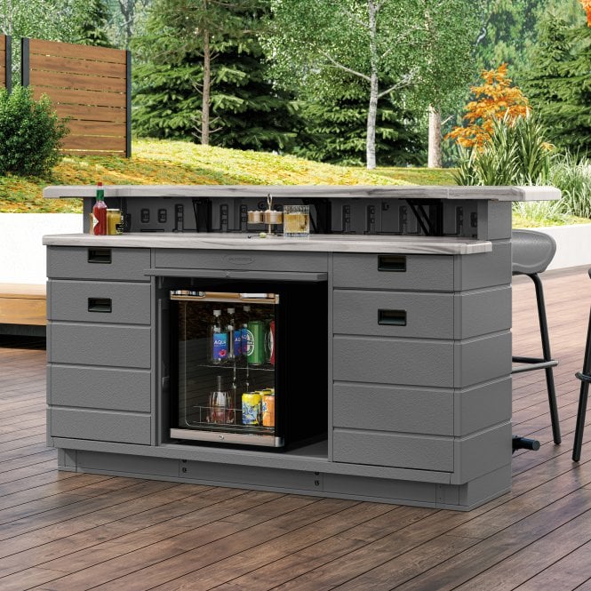 Add style to your deck or patio with the Suncast® Garden Oasis® Entertainment Bar. Featuring four pull-out drawers, a concealable centre compartment capable of housing a mini-fridge, and a variety of compatible accessories (sold separately) this bar has room for all your entertainment needs. With space for up to four bar stools, an attractive Marblecast Design™ Countertop and a clean modern look, your garden will soon become the envy of your neighbourhood.