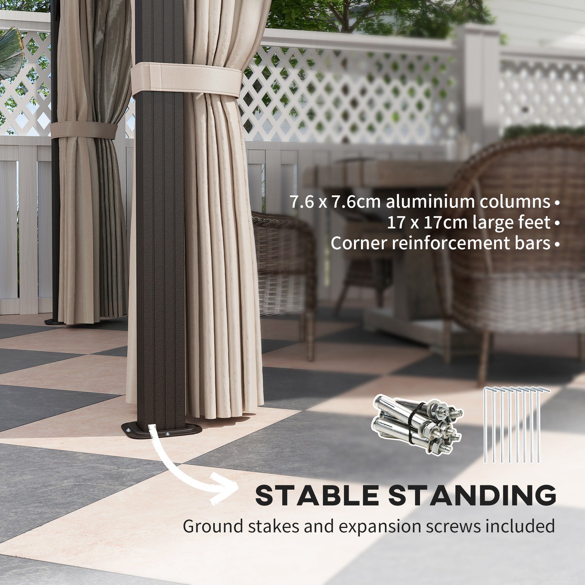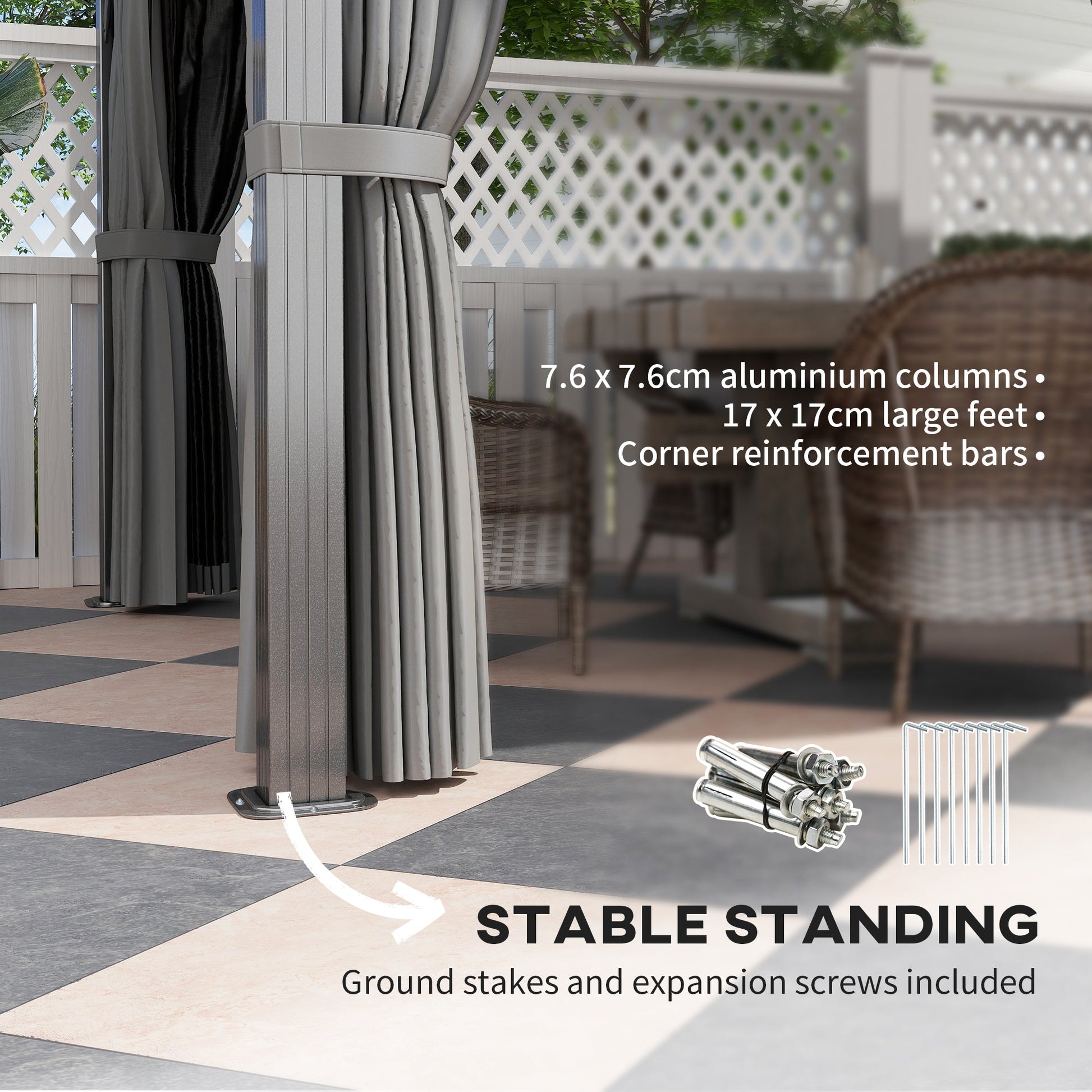 ● 7.6 x 7.6 cm aluminium columns, 17 x 17 cm large feet and corner reinforcement bars for unmatched stability