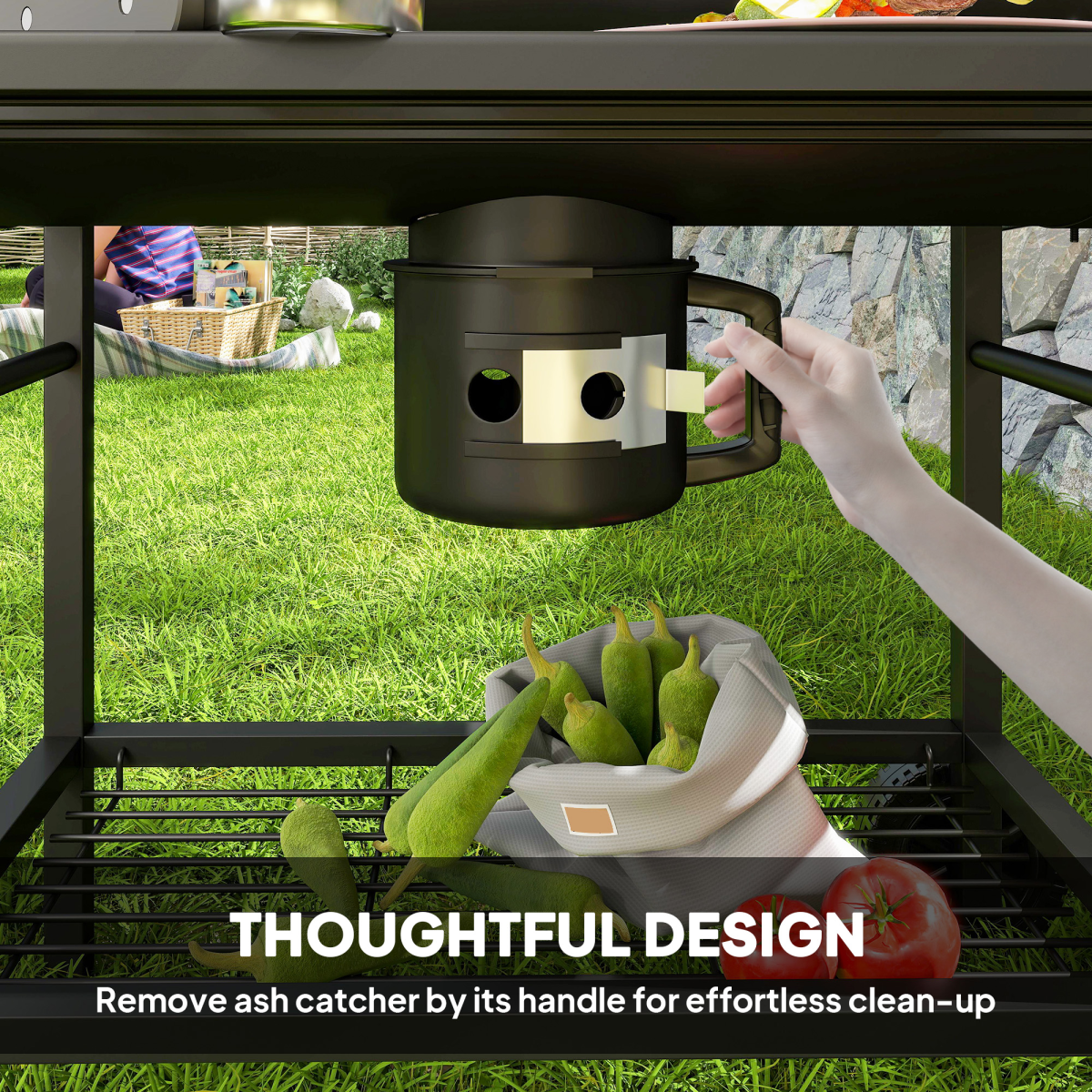● Removable ash catcher with a handle for effortless clean-up