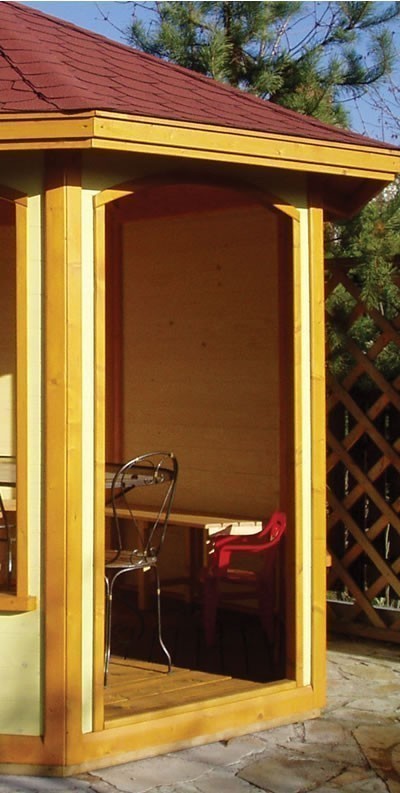 An octagonal pavilion with four open sides. The Lyon measuring 3m (9'8") in diameter. Pretty arch detail above the door and window openings make this a lovely place to relax in your garden and would make an attractive focal point especially if painted in contrasting colours as pictured.