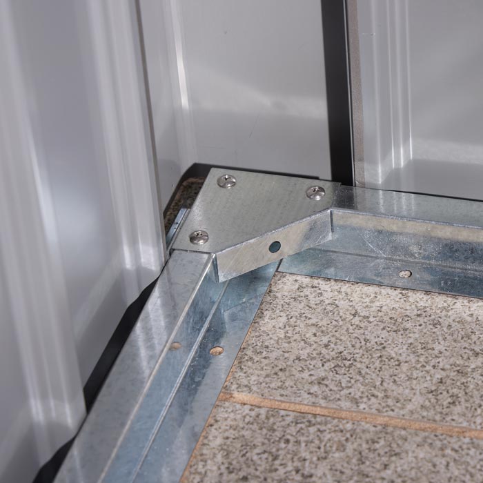 Apex style roof, Double doors with low threshold for easy access, Robust handle and cylinder lock mechanism, Lever lock top and bottom on slave door, Dual layer door material construction, Three hinges per door, High strength 0.5-1.2mm thick hot dipped galvanized steel frames, Front & rear drainage channels, Downspouts at each corner to easily divert rain water to water butt or drain, Wall & roof panels from 0.4mm hot dipped galvanised steel, Wall steel up to twice the thickness of standard metal sheds, Finished in an attractive metallic grey paint, Door fitted to 10′ side only, Fire & rot resistant, Low maintenance, Floor not included