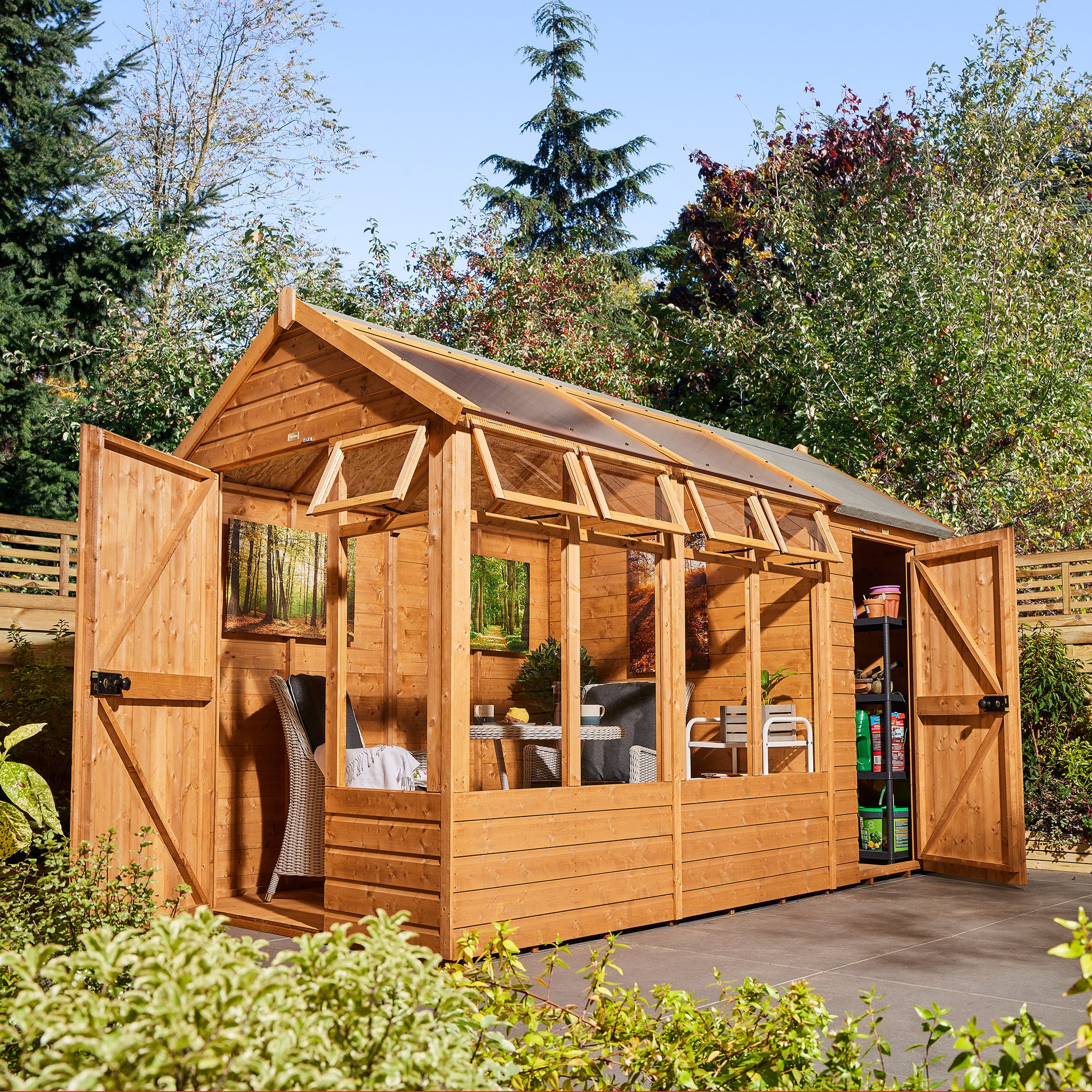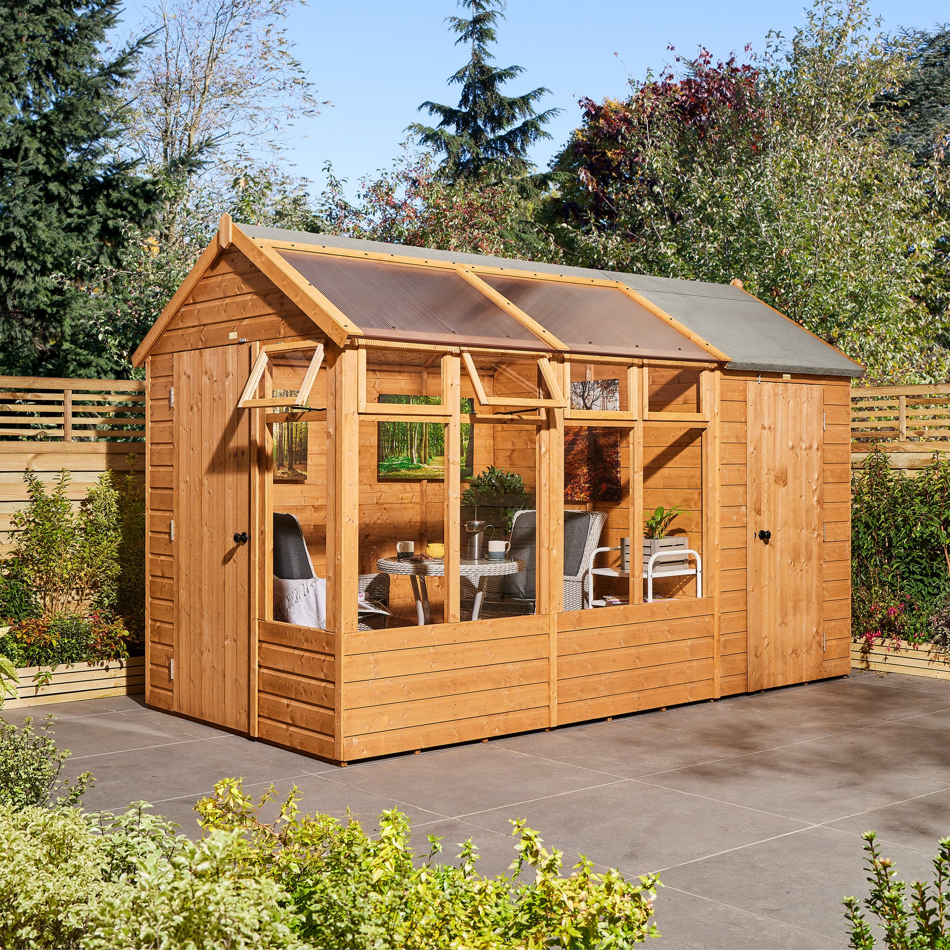 A Greenhouse or garden room with a handy storage shed