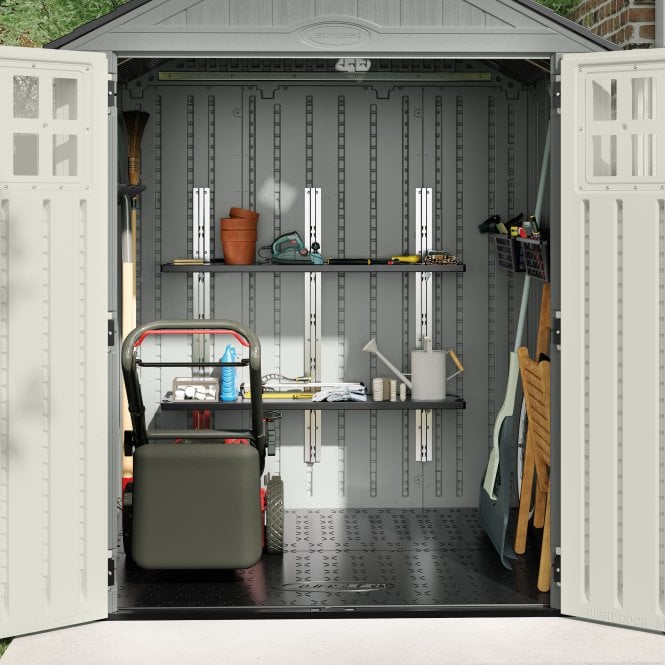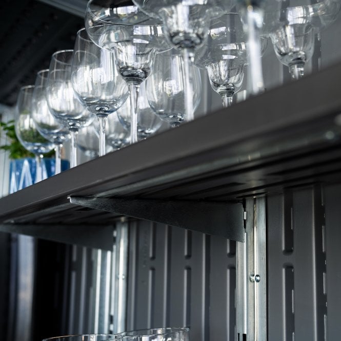 Get the most out of your Suncast resin shed with the versatile Suncast Shelving Kit. Compatible with a wide selection of the Suncast range, this handy kit is made up of two shelves which each have a capacity of 23kg and a combined 0.64m² of surface space. Constructed from robust resin with a strong steel reinforcement bar and screws that allow for easy installation, with six height settings for each shelf, creating flexible extra storage for your shed.