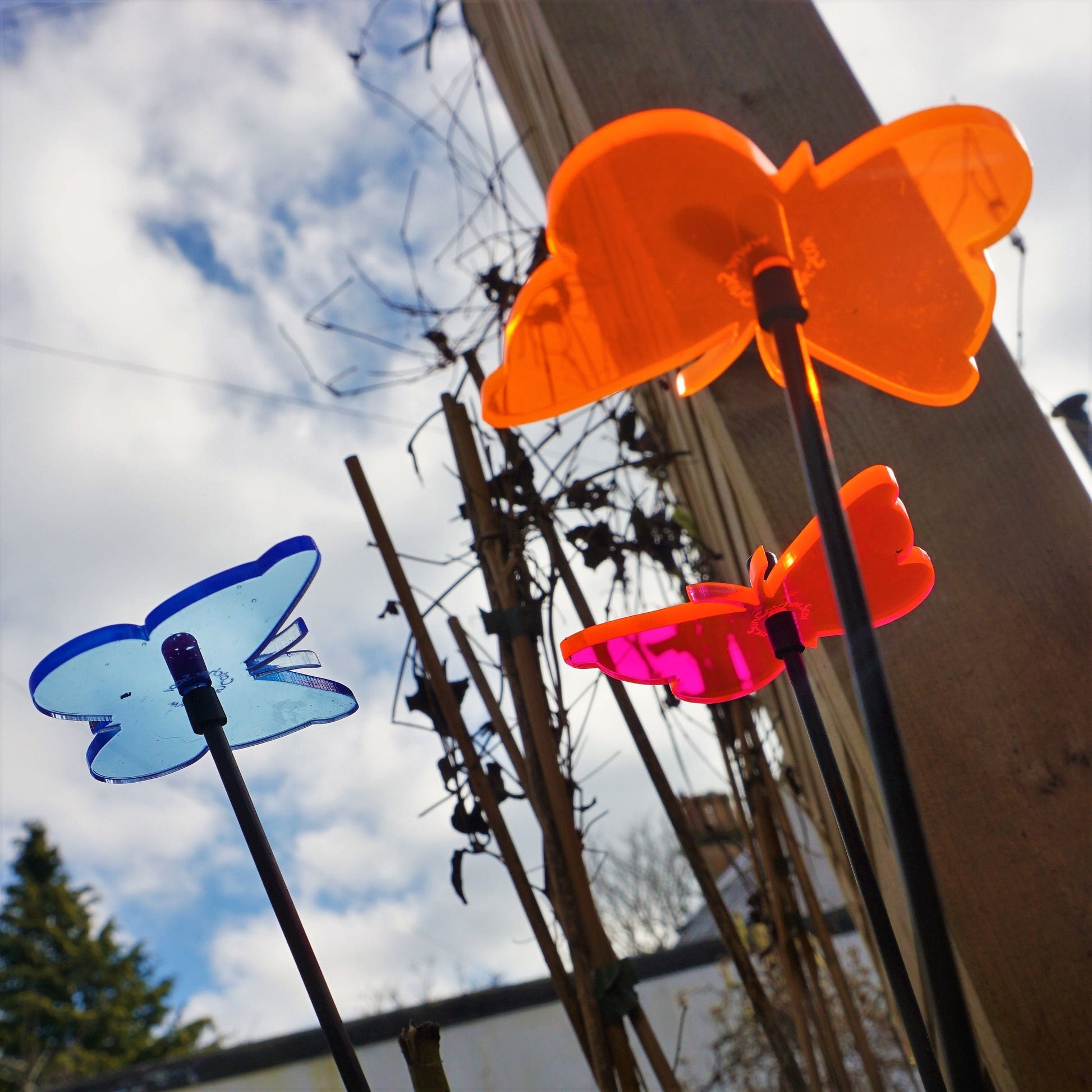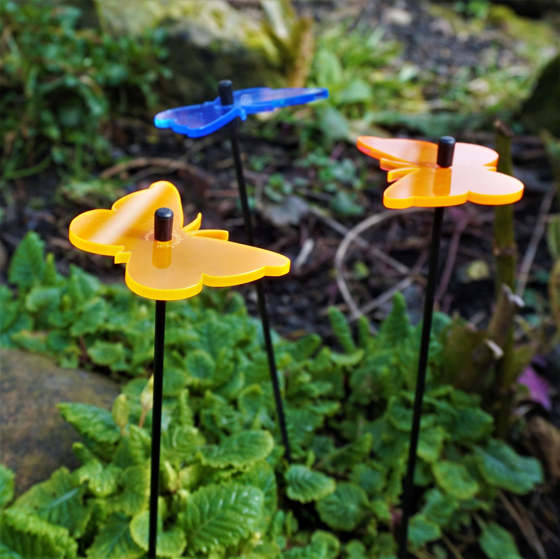 This Set of 3 SunCatcher 'Gatekeeper Butterfly' consists of:- three wide, glowing light collector in red, orange, yellow, green or blue - three 25cm long, black swing rod, - matching support rings and end caps. Planted it is about 20cm high and looks great in your flower bed or pot.