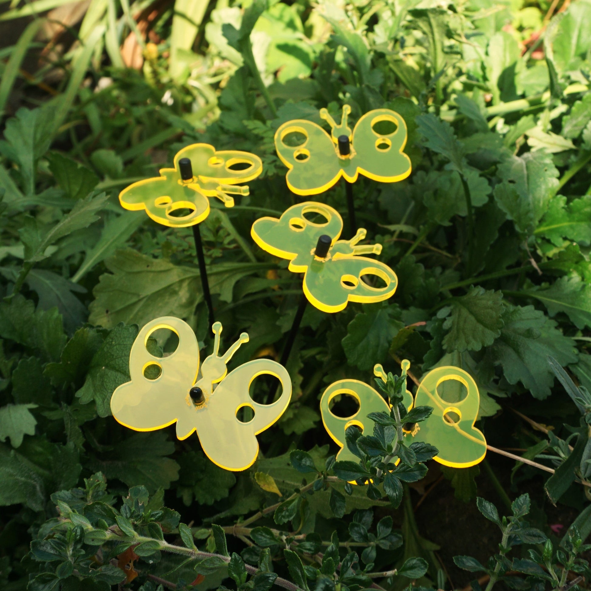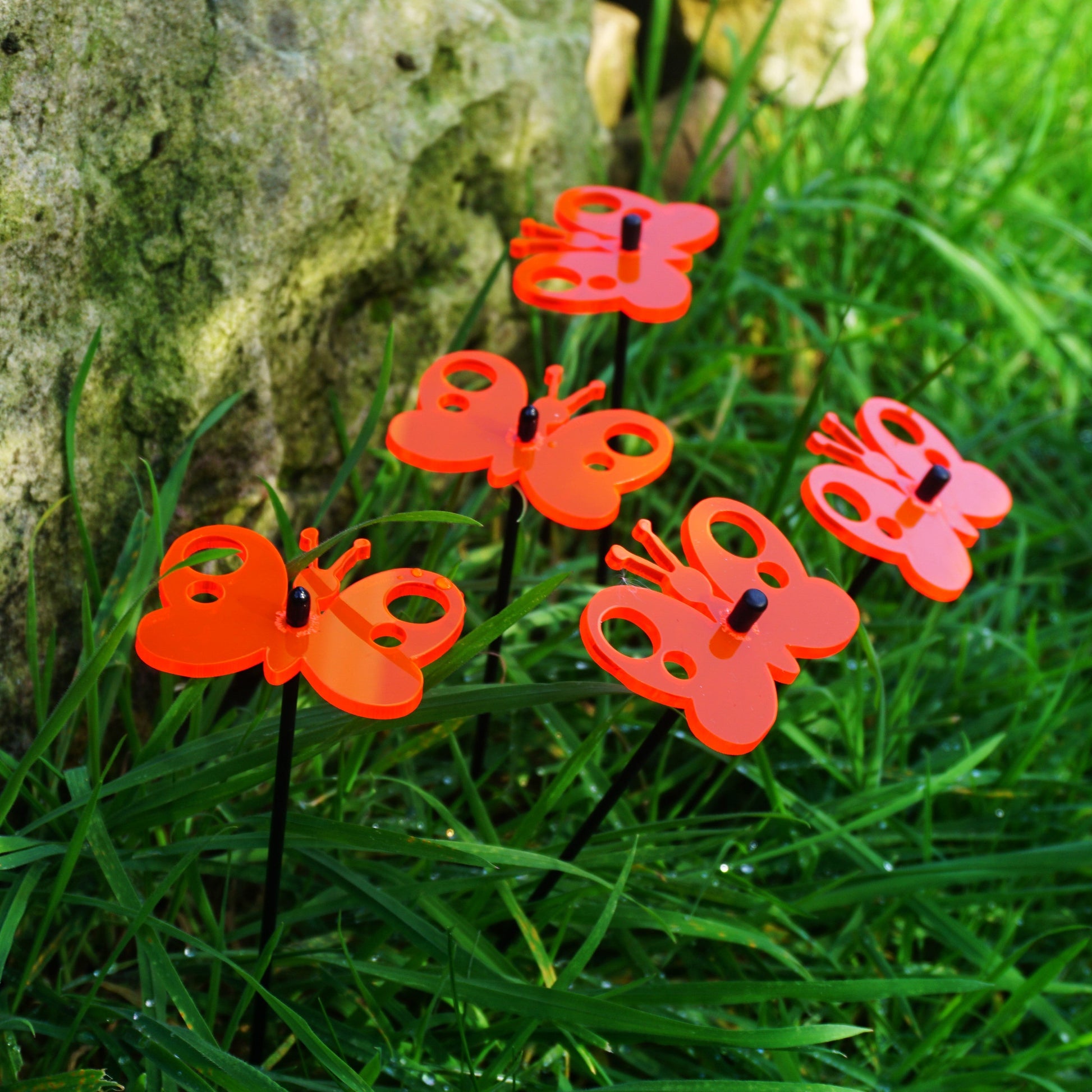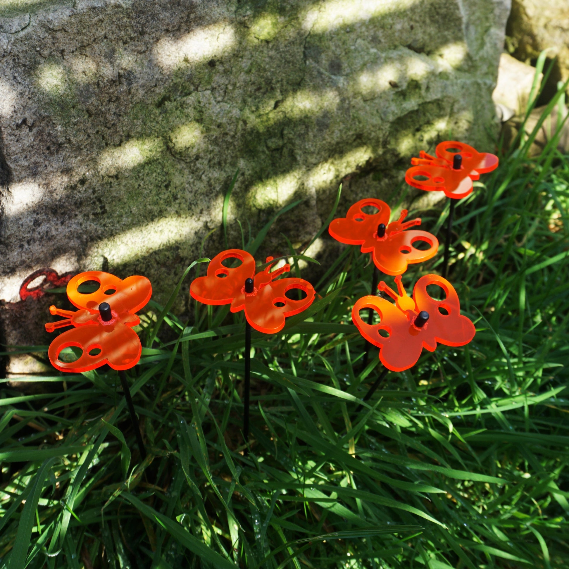This Set of 5 SunCatchers 'Peacock Butterfly' consists of:- a five wide, glowing light collector in red, orange, yellow, green or blue- five 25cm long, black swing rod,- matching support rings and end caps. Planted it is about 20cm high and looks great in your flower bed or pot. What are SunCatcher? SunCatcher are a new and unique form of garden decoration. They collect the light of the sun and shine for you when the sun is not. SunCatcher come in various colours, shapes and sizes. You will find a huge variety of small, midsize and large flowers, little geckos, sheep or owls as well as small and big butterflies, kites and even wind spinners. All designed to add some extra colour to your garden.