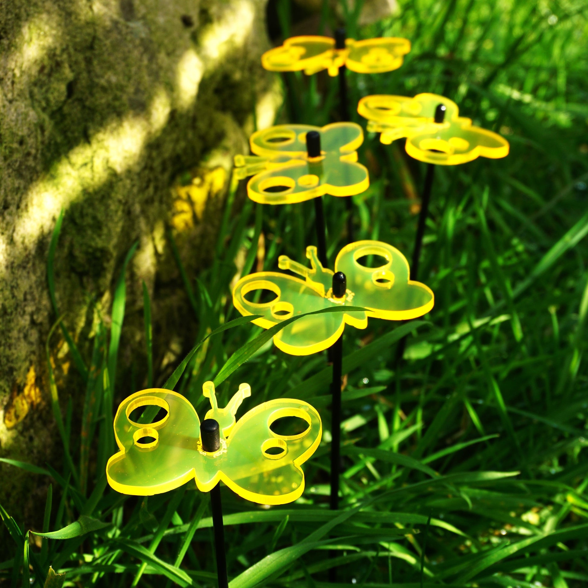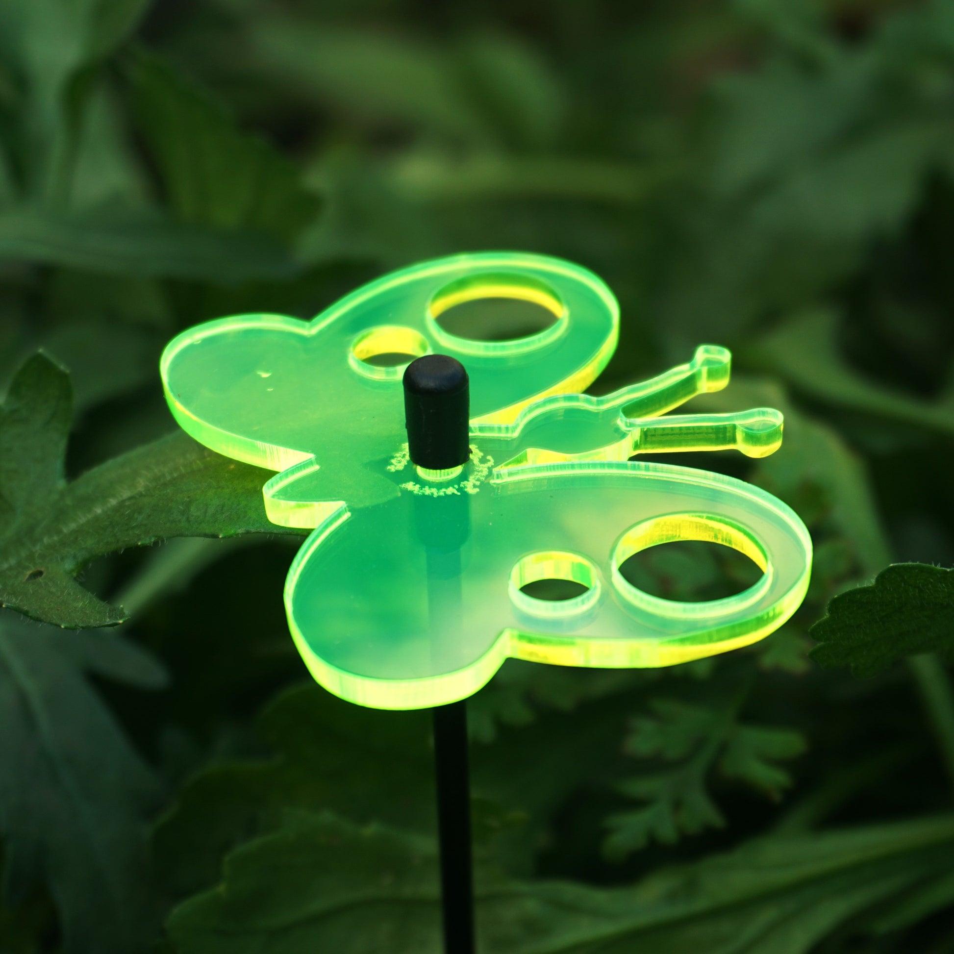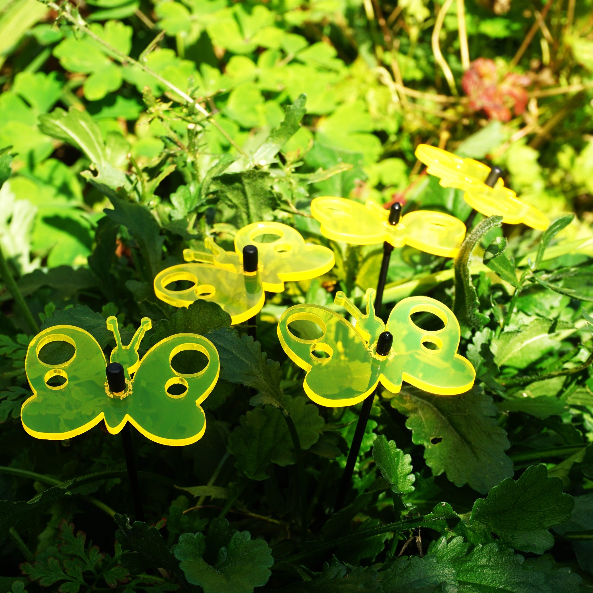 This Set of 5 SunCatchers 'Peacock Butterfly' consists of:- a five wide, glowing light collector in red, orange, yellow, green or blue- five 25cm long, black swing rod,- matching support rings and end caps. Planted it is about 20cm high and looks great in your flower bed or pot. What are SunCatcher? SunCatcher are a new and unique form of garden decoration. They collect the light of the sun and shine for you when the sun is not. SunCatcher come in various colours, shapes and sizes. You will find a huge variety of small, midsize and large flowers, little geckos, sheep or owls as well as small and big butterflies, kites and even wind spinners. All designed to add some extra colour to your garden.