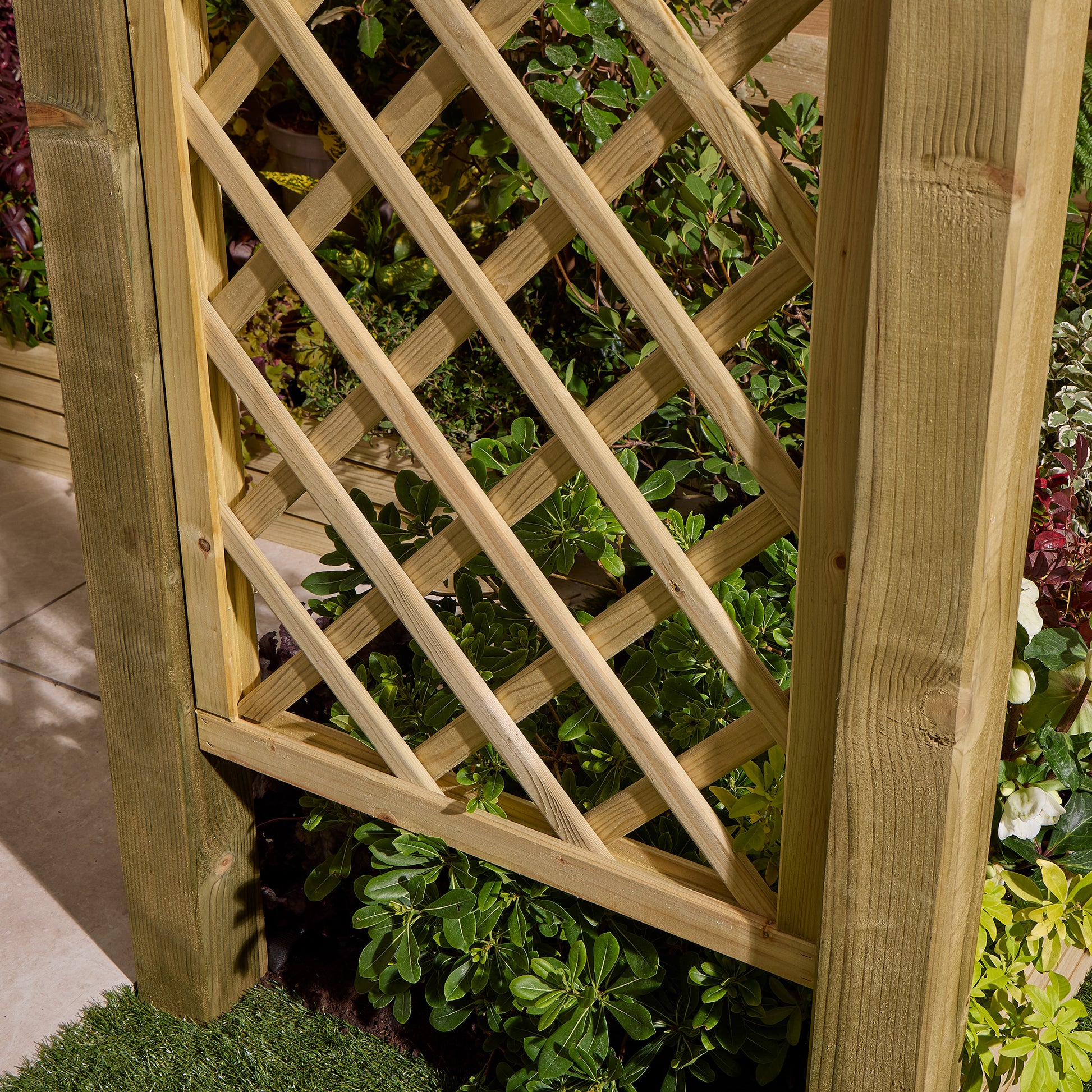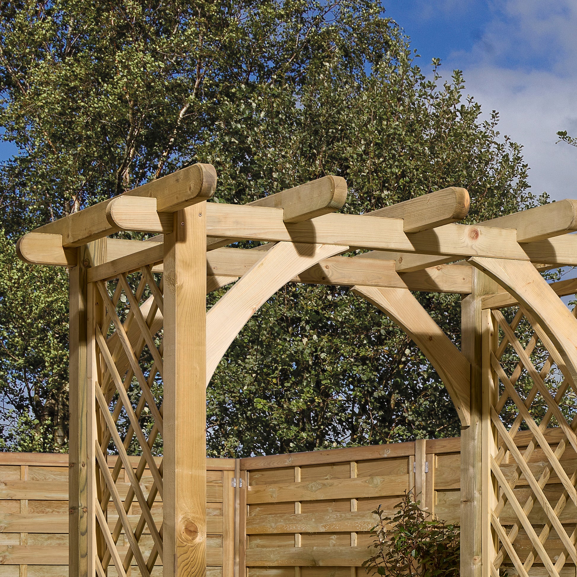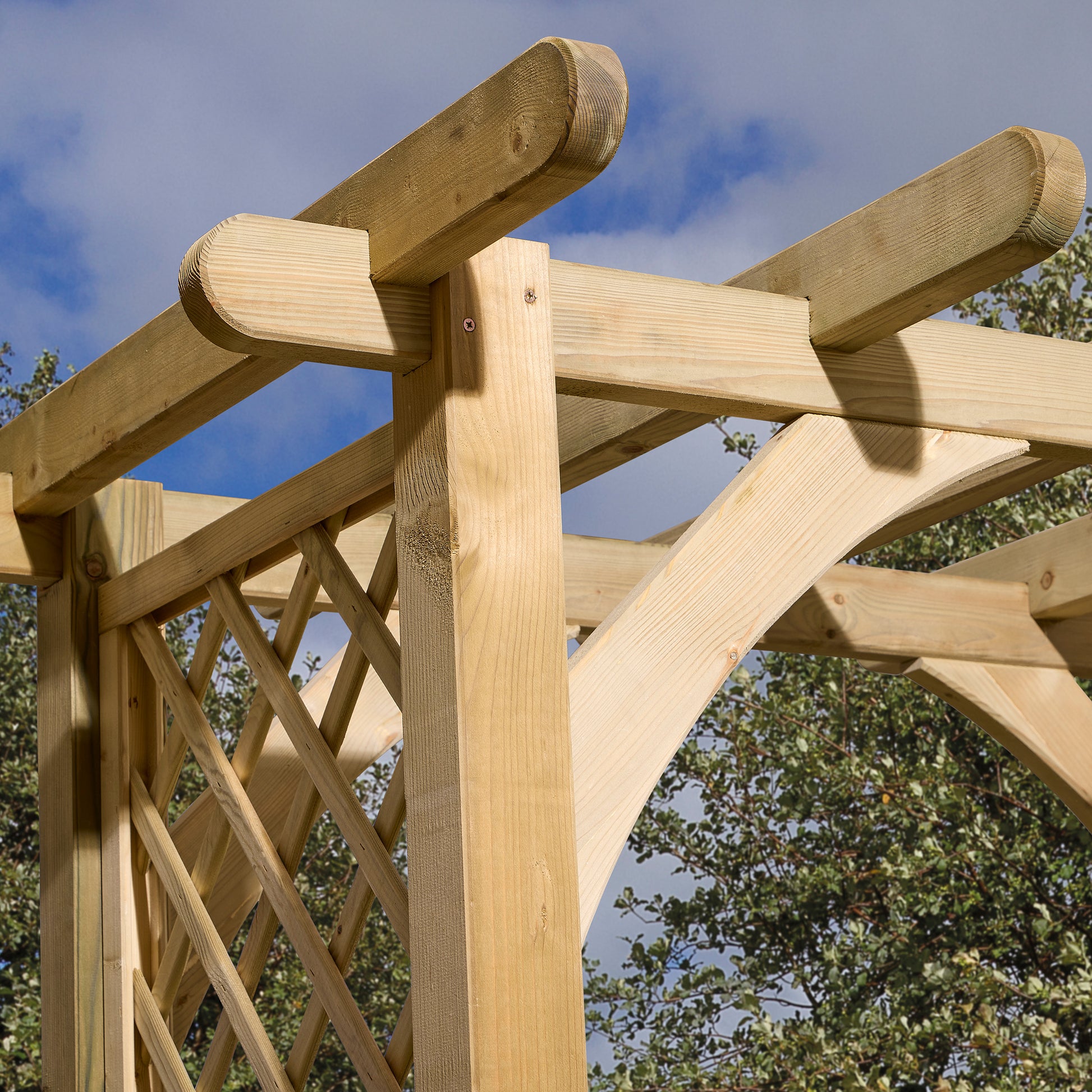 This heavy-duty arch will create an impressive statement piece in any garden whether it’s to add height and shape or to create a divide to garden spaces. The diamond lattice sides are perfect for supporting climbing plants. The concaved curve shape to the diagonal bracing and rounded roof rafters adds further depths to its elegant charm. Pressure treated timber ensures this sturdy structure is built to last.
