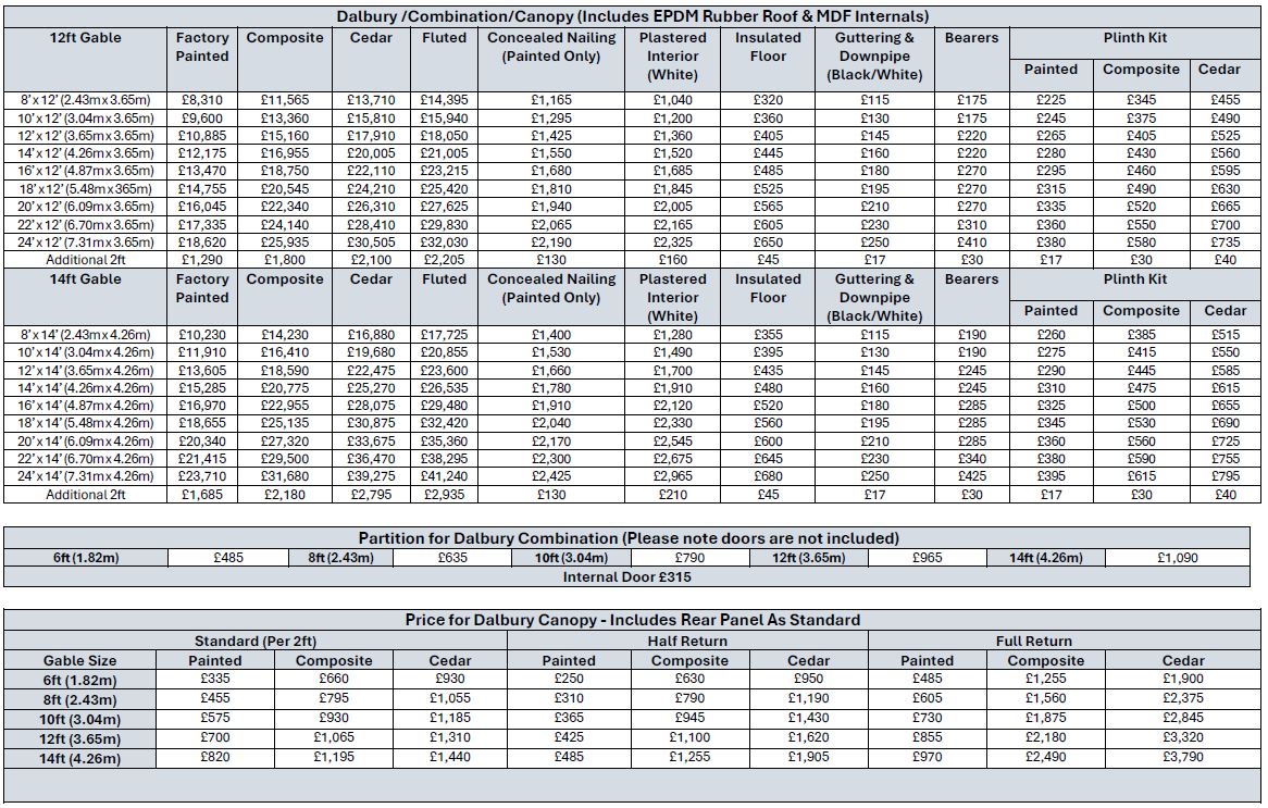 Base building prices start from £4315, depending on size and configuration, you must add onto the price doors, windows and other considered options, which are all priced separately. Orders will not be processed until all options have been discussed and confirmed in writing.