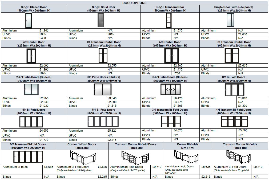 - Aluminium Doors - Single Glazed, 4’ Double, 5’ Double, 3m, 4m and 5m Bi-folds (5% charge added for non-gable configuration on Bi-folds)