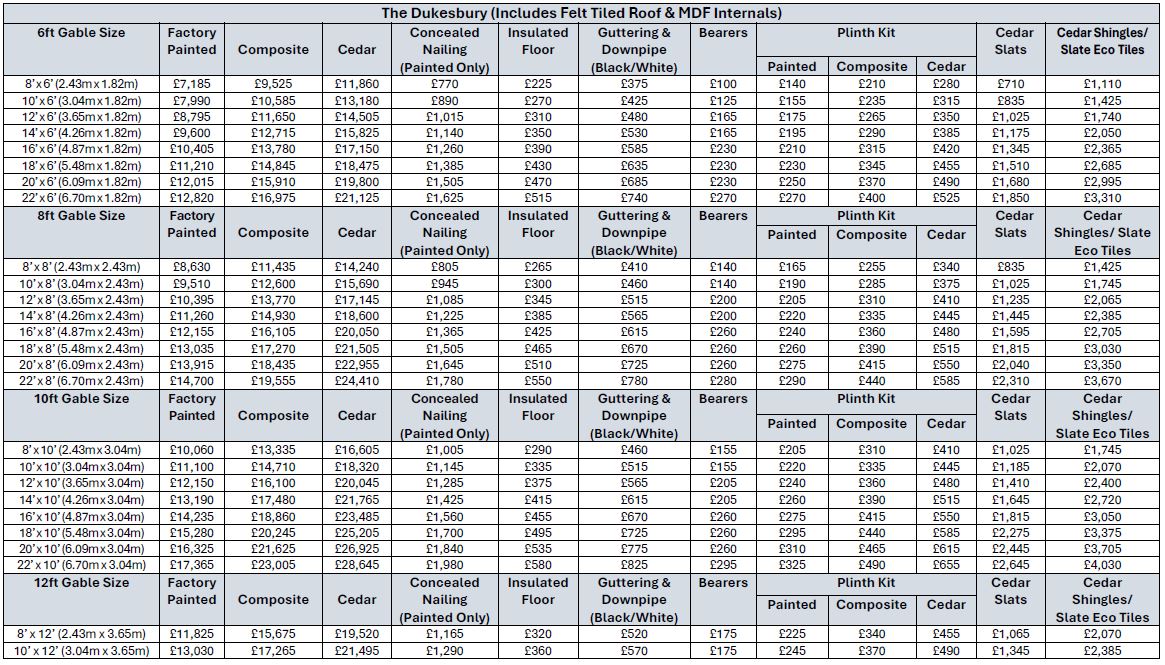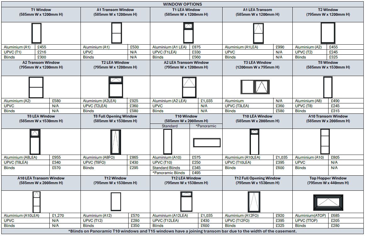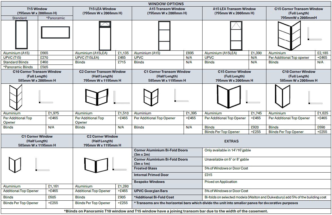 Base building prices start from £7185 depending on size and configuration, you must add onto the price doors, windows and other considered options, which are all priced separately. Orders will not be processed until all options have been discussed and confirmed in writing.