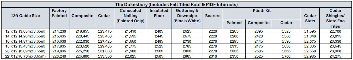 The Dukesbury comes as standard, the building features a felt tiled roof in a choice of colours - red, brown, green or black.. because of the height unless it will be situated more than 2m away from the boundary it is advisable to check with your local planning authority as in most cases height restrictions may apply..
