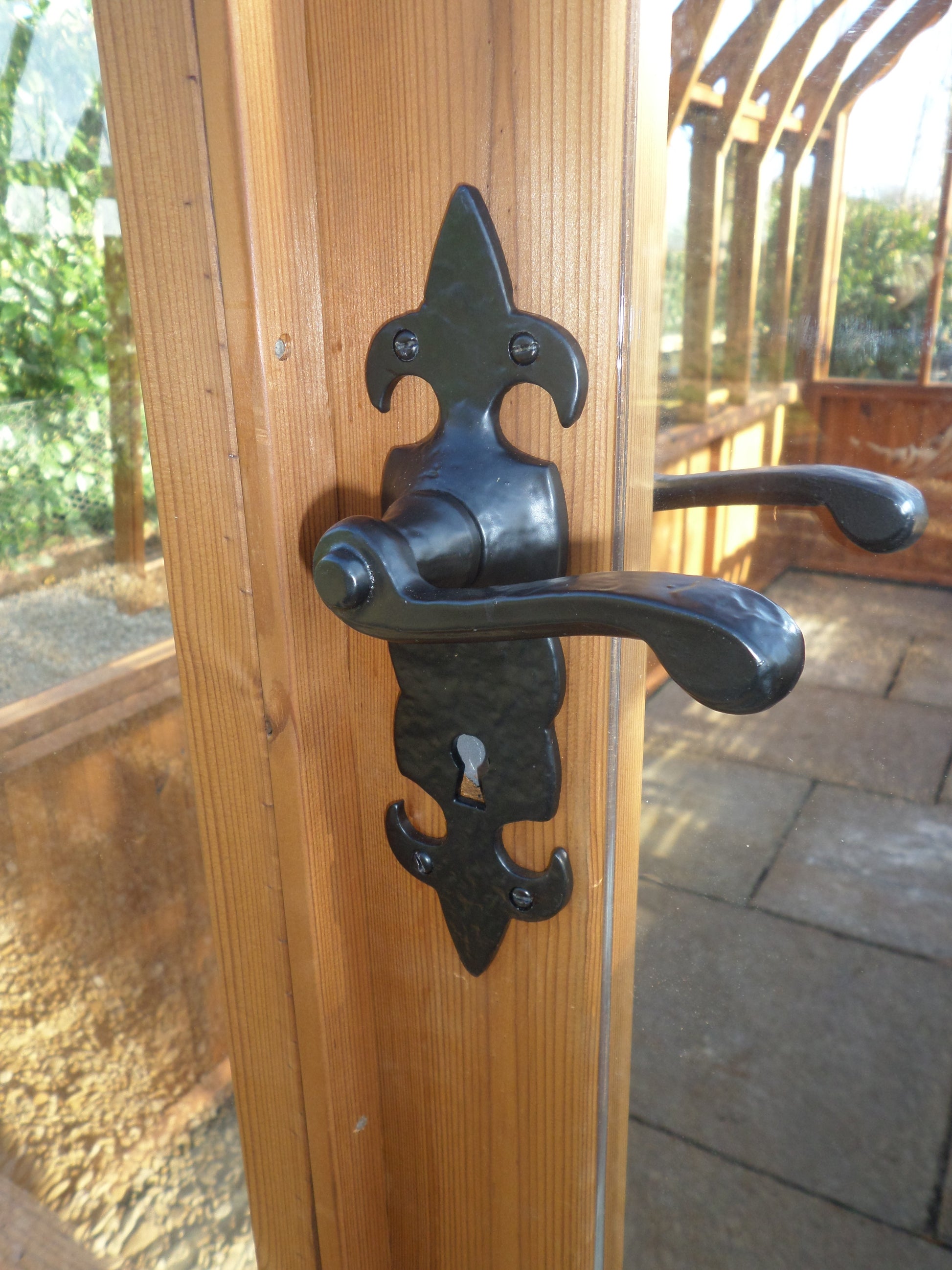 - Black ornate handle, hinges and window stays