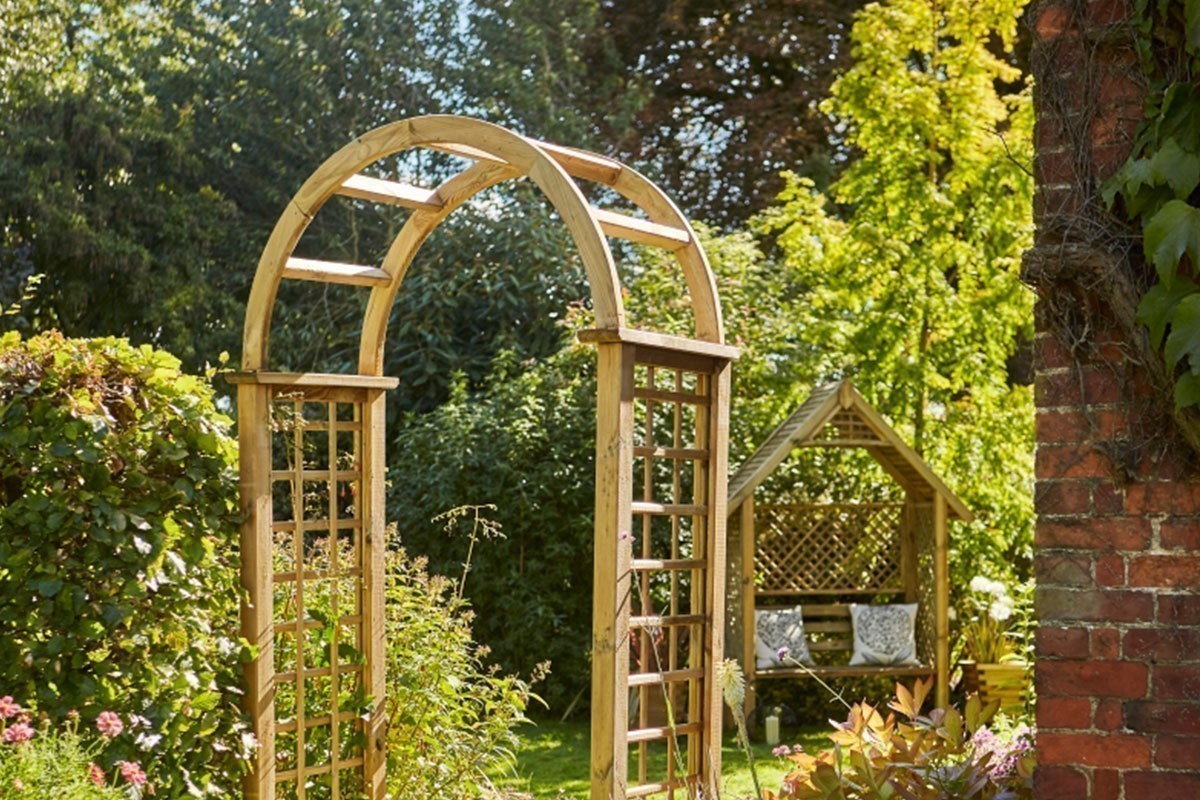 The Elite Granville Arch has a classical look as well as being strong and robust. This arch is suitable as a freestanding structure on either a path or garden space. The square trellis sides are ideal for climbing plants. Made from pressure treated timber and finished in pale green for longevity in use.