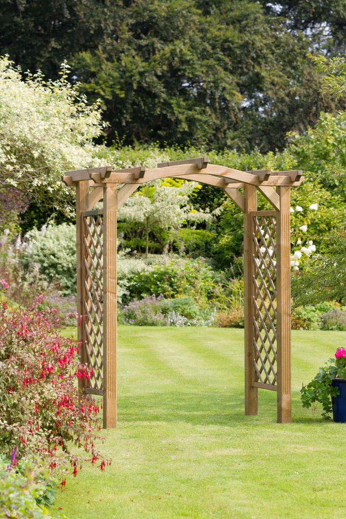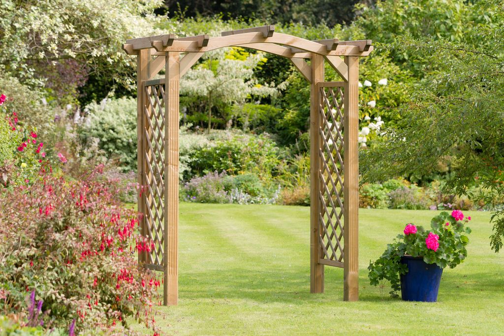 The Venus Arch enhances any garden walkway with it's curved roof and diamond trellis side panels. Both aesthetically pleasing in its natural state, as well as covered in a variety of your favourite climbing plants. A strong structure with 90mm sized posts that can be secured in the ground with the optional fixing kit.