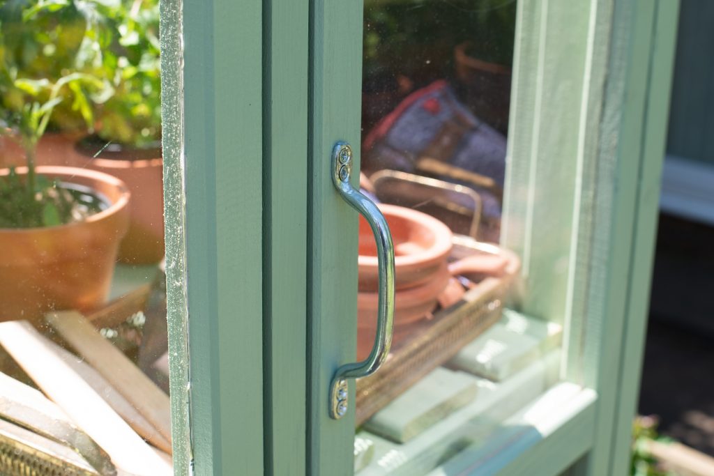 - Images show greenhouse painted with Thorndown Paints Sedge Green