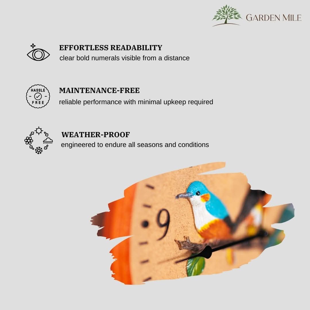 Our garden clock is fully weather-resistant and waterproof, with batteries encased in a waterproof cover to protect the clock mechanisms. Made from durable materials, this clock is perfect for outdoor use. Its simple and elegant design makes it ideal for decorating both indoor and outdoor spaces such as patios, kitchens, living rooms, greenhouses, or gardens.