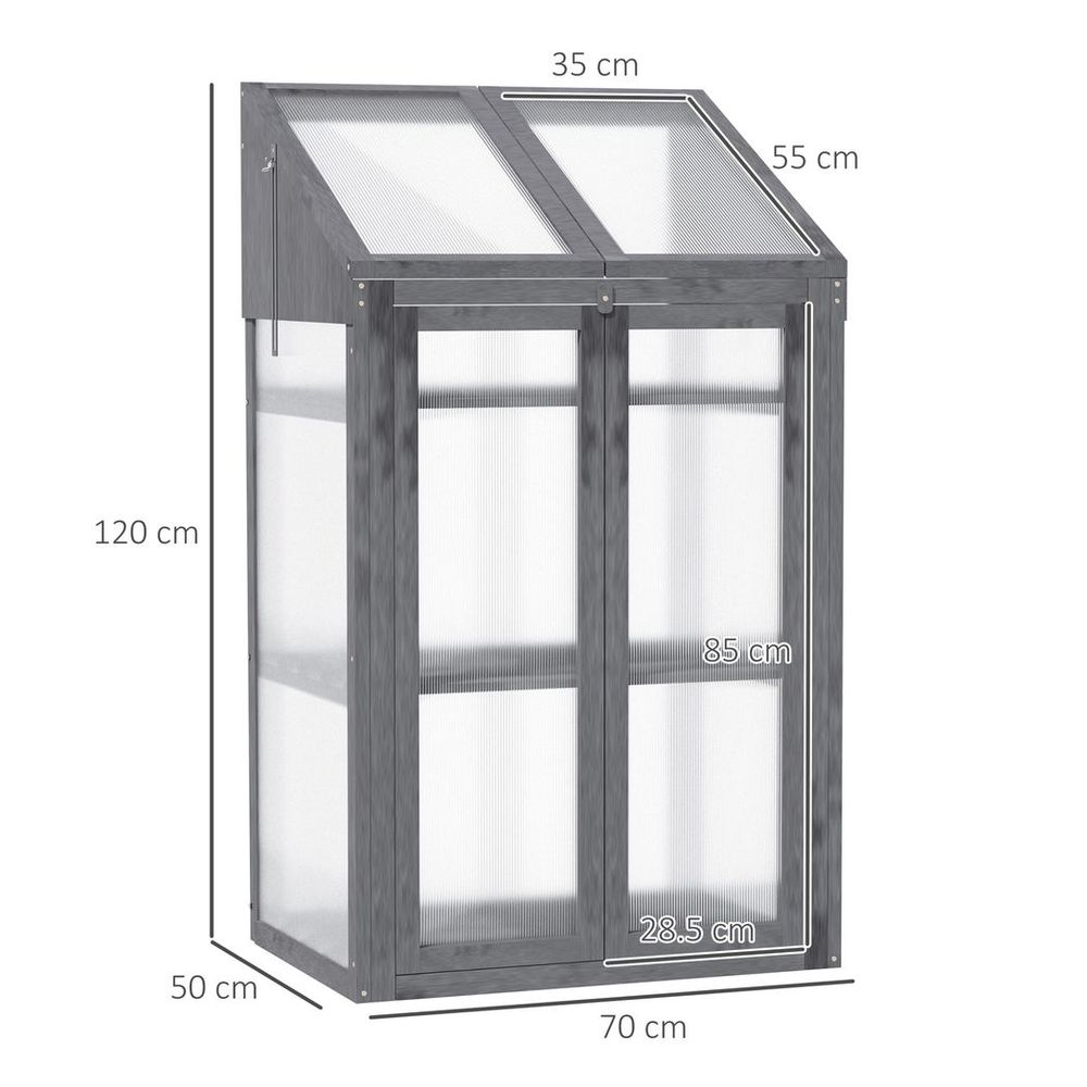 THREE SLATTED SHELVES: Paneled design prevents liquids building up, levels create space for plants, vegetables, fruits and more.INDEPENDENT TOP ROOF AND DOUBLE DOORS: Opens for easy access, easy for plants to absorb the sunlight and get fresh air inside. Close on rainy days. Doors for easy access inside, with latch lock for security.FIR WOOD FRAME: Cold frame cupboard is strong. 4mm plastic panels allow light inside, retaining heat for helping maximum growth.DIMENSIONS: 70L x 50W x 120Hcm. Shelf: 65L x 45W x 2.2Hcm.MAXIMUM LOAD 15KG PER SHELF. ASSEMBLY REQUIRED.